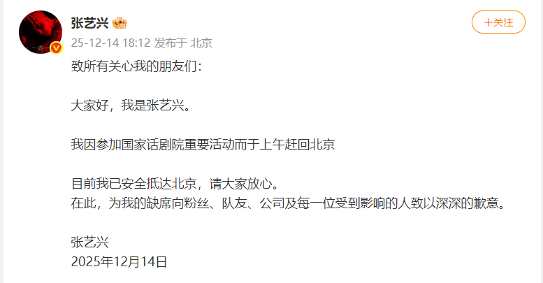 #张艺兴发文道歉#张艺兴回应缺席EXO见面会,因参加国家话剧院重要活动而于上午赶回北京,为缺席向粉丝、队友、公司及每一位受到影响的人致以深深的歉意。 #张艺兴 国家话剧院活动##EXO咆哮开场#
