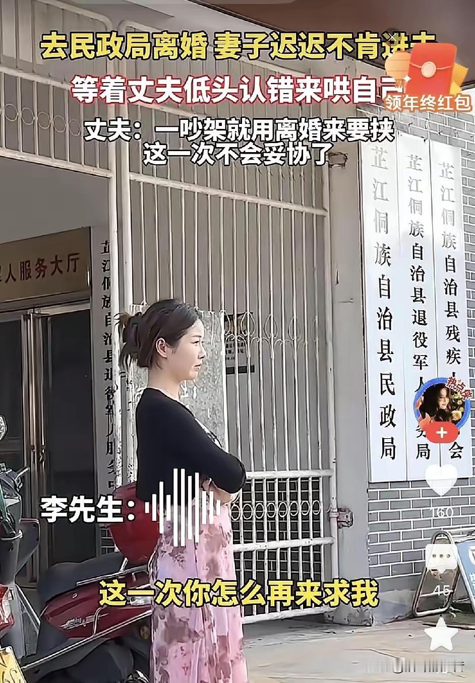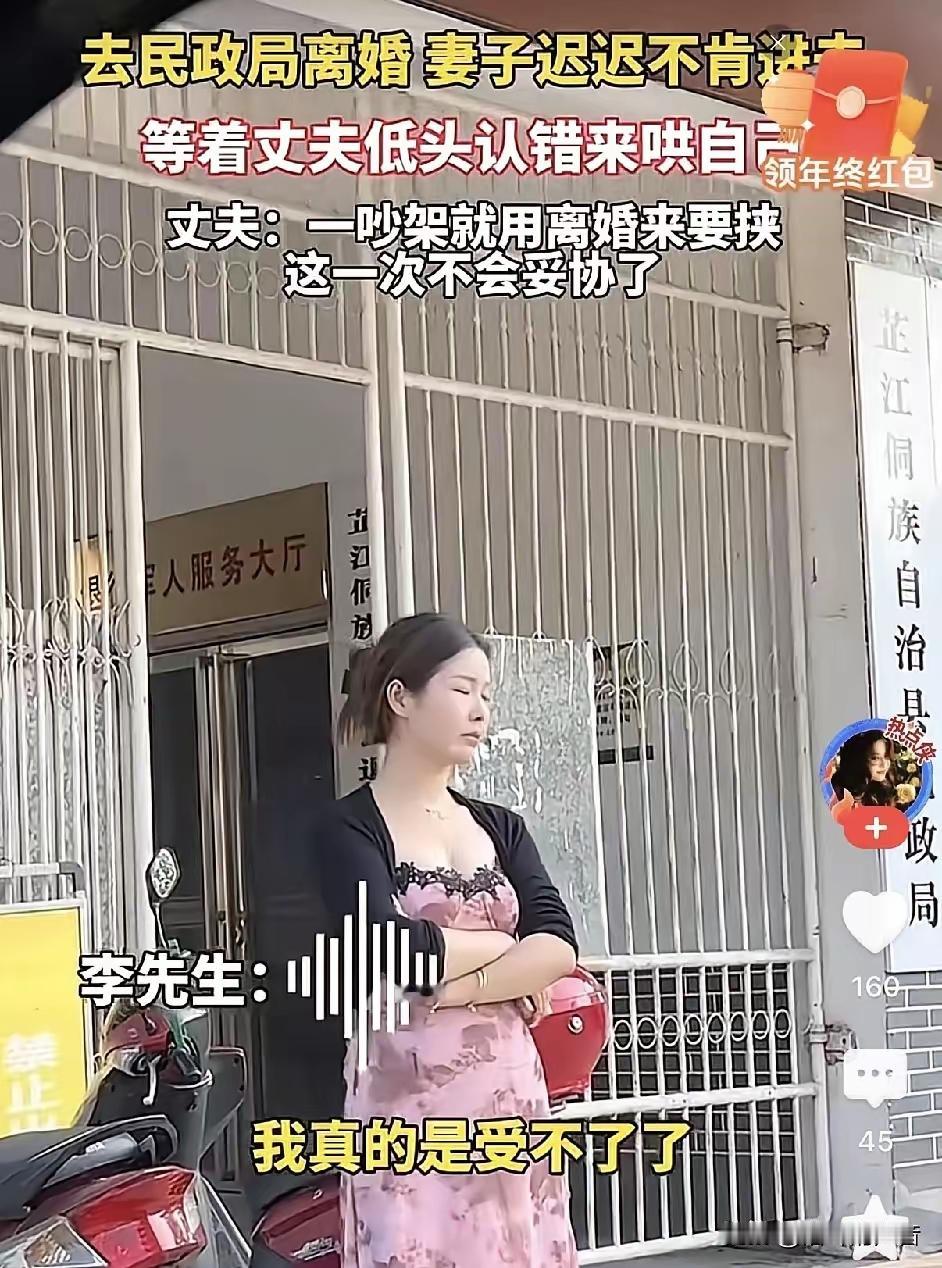 恩爱夫妻因琐事冲动闹离婚,民政局门口妻子泪崩悔意生:只盼他回头哄我 平日里伉俪情深的一对夫妻,却因一件微不足道的小事起了争执。争吵中两人互不相让,一时冲动便决定离婚。 次日一早,两人如约来到民政局办理离婚手续。可就在即将迈进办事大厅的刹那,妻子突然停住脚步,迟迟不愿进门。她站在民政局门口,眼眶泛红,泪水夺眶而出,满心委屈地期待着丈夫能察觉她的不舍,回头哄哄自己。 原来,这场“离婚”并非她的真心意愿,不过是想借着冲动给丈夫一个“教训”,盼他低头认错。让她没想到的是,这次丈夫竟当了真,径直走进办事大厅,头也不回。 这场因冲动而起的婚姻风波最终走向如何,目前还是未知。