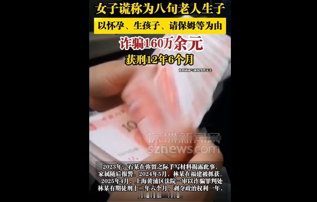 35 岁福建女子林某 2019 年在上海认识七旬老人石某并发展关系,2020 年回福建结婚生子后,却谎称怀了石某的孩子,还虚构孩子 “石一凯” 的存在,从 2020 年 8 月到 2023 年,以怀孕、养娃、请保姆、买车装修等为由骗走 160 余万元。 石某弥留之际家属报警,林某 2024 年被抓,一审被判 12 年半,她上诉称钱是赠与,二审仍维持原判,违法所得需追缴发还。 林某这哪是诈骗,分明是把老人当 “提款机” 往死里坑! 自己都在福建结婚生子了,还回头编 “给你生娃” 的瞎话,连孩子名字都编得有模有样,从怀孕到养娃再到买车装修,谎言一套接一套,骗了三年都没露馅,心黑得没边了! 八旬老人本来就孤独,她专挑这点下手,用 “亲情” 当诱饵,把老人的养老钱骗光,连老人快不行了都没停手,简直是丧良心! 再说家属也够失职的,老人三年花出去 160 万,又是养娃又是买车,居然没察觉不对劲? 要是平时多关心关心老人,多问问钱的去向,哪能让骗子得逞这么久? 法律判得还算解气,12 年半的牢饭够她好好反省了!