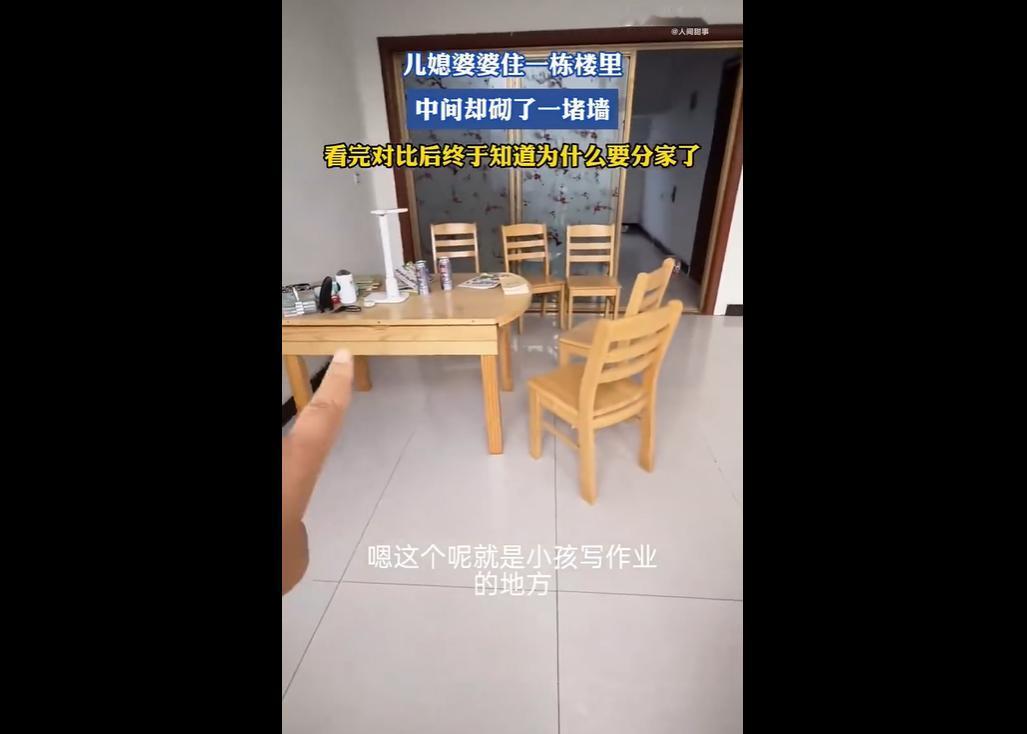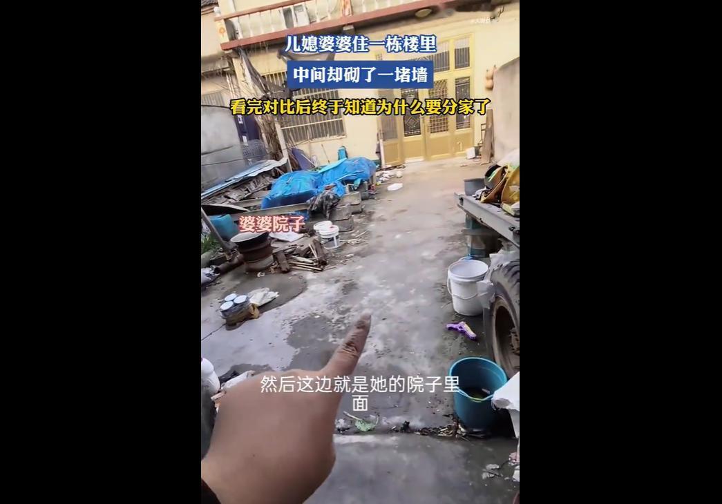 江苏一儿媳跟婆婆住同栋楼,忍不了婆婆封公共过道、随便进她屋乱瞅、还瞎掺和带孩子,最后干脆砌堵墙隔开。 她拍视频晒自家干净得能反光,再对比婆婆家堆杂物、厕所放大葱的乱样,这事儿让大伙吵翻了天,都在说婆媳矛盾和代际差异。 说实话,这婆婆有点拎不清! 公共过道凭啥你说封就封? 人家小两口的屋子,你推门就进跟逛菜市场似的,还管东管西插手带孩子,这哪是帮忙,纯属添乱! 老辈人总觉得 “一家人不用分那么清”,可再亲也得有边界,别拿 “为你好” 当越界的借口! 再说她老公呢,说难听的就是个 “妈宝软蛋”! 老婆跟妈闹成这样,他要么躲一边装哑巴,要么帮着亲妈说话,把媳妇逼得只能靠砌墙求清净,这婚结得跟守活寡似的,要你这丈夫有啥用? 婆媳矛盾里,最该死的就是这种没担当的男人! 当然这儿媳也不是省油的灯,砌墙解气归解气,但拿手机拍婆婆家的乱样发网上博眼球,是不是有点不地道! 老人一辈子的生活习惯改不了,你可以不认同,但别把家丑公之于众让人家被笑话,这跟往老人心上捅刀子没啥区别! 真要解决问题,先让老公站出来扛事,心里划清边界,比砌十堵墙都管用!