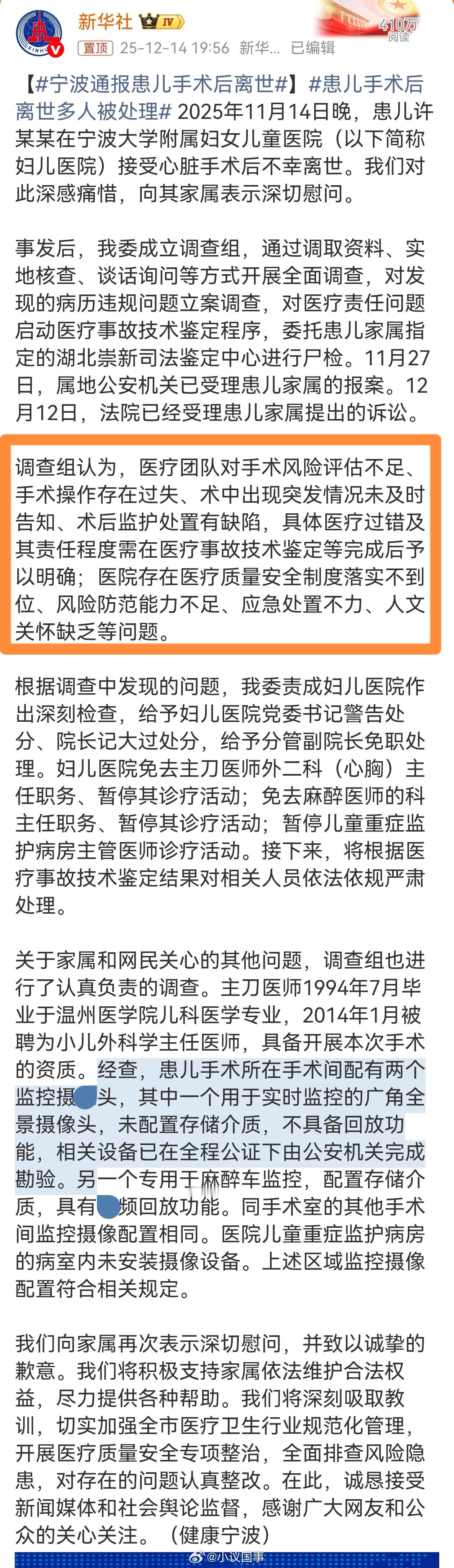 术前风险评估不足、手术中操作存在过失、术中出现突发情况未及时告知、术后监护处置有缺陷……虽然具体过错还需技术鉴定,但按照调查组的上述公开表述,医疗人员的行为已经属于“严重不负责任”,已经涉嫌构成医疗事故罪。更为离谱的是,手术室监控手术全过程的监控摄像头竟然没有储存硬盘,也无法回放手术的全过程。这样一来,手术过程的还原就只能靠医疗人员的供述和尸检鉴定和技术鉴定报告了。通报说这种监控摄像配置符合相关规定,但确实给案件侦破和时间调查增加了难度。家属已经报警追究刑事责任,也提起了民事诉讼。对于民事诉讼的官司可以和刑事案件的侦查同步进行。但稳妥起见,可在刑事案件侦查终结后,再进行民事诉讼。对于这家医院的追责,也不能仅限于对几位院领导和医疗人员的处分和追责。