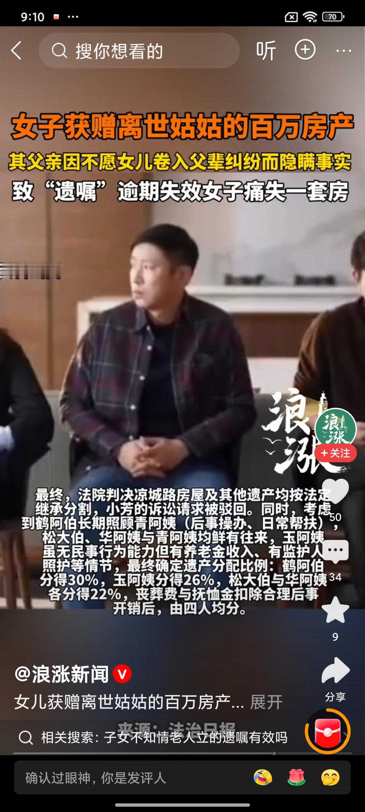 女主获赠姑姑房产,却因父亲隐瞒痛失,网友:这操作把女儿坑惨了 谁能料到,一份承载着姑姑疼爱的百万房产遗赠,竟被父亲的“迷之操作”搞砸,最终侄女一无所获。 看完这事,着实让人替当事人感到惋惜! 女子的亲姑姑去世后,父亲在整理遗物时发现了一份关键遗嘱——姑姑明确将名下价值百万的房子留给侄女一人。 然而,父亲看完后却选择隐瞒,既未告知女儿,也未让任何人知晓,理由竟是“不想让女儿卷入上一辈的恩怨”。 要晓得,姑姑生前仅与女子家来往密切,和大伯以及另外两个姑姑等兄弟姐妹早已断了联系。可父亲不仅瞒着女儿,就连姑姑去世的消息也未主动告知其他亲戚。直到一年后,大伯等人偶然得知姑姑离世,立刻带着其他姐妹找上门,要求法定继承姑姑的遗产。 此时,父亲依旧没敢拿出遗嘱,还试图自己出面调解,想和兄妹们私下分配遗产,结果自然是谈崩了。 后来女子终于得知遗嘱的存在,赶忙让父亲拍了照片发给大伯等人,可对方根本不予理会。 没过多久,大伯等人直接将女子父亲告上法庭,要求继承全部遗产,还包括父亲之前领取的丧葬费和抚恤金。 更令人崩溃的是,女子其实早就听姑姑说过要把房子留给自己,但她一直没当回事,也没去办理任何接受遗赠的手续。 根据《民法典》规定,受遗赠人必须在知道受遗赠后60日内,明确表示接受遗赠,否则就视为自动放弃。 就因为父亲的隐瞒和自己的疏忽,女子彻底丧失了继承权,百万房产最终落入了几乎没来往的亲戚手中。 这事传到网上,网友们炸开了锅: “父亲的理由太牵强!真为女儿好,难道不该赶紧帮她办过户?现在反倒让女儿卷入官司,啥都没得到” “上辈恩怨和侄女的遗赠有啥关联?说不定父亲有自己的私心” “女子也有点粗心,明知姑姑要赠房,咋不主动跟进手续?现在说啥都晚了”。 在我看来,这位父亲的做法实在令人费解。 隐瞒遗嘱既违背了逝者的遗愿,又害了自己的女儿,最后还引发家庭矛盾闹上法庭,妥妥的“三输”局面。如果他真担心女儿卷入恩怨,最该做的就是及时拿出遗嘱,帮女儿完成法定手续;退一步说,就算暂时不想声张,也该提醒女儿及时表态接受遗赠。 而女子自身也有不可推卸的责任,明知有赠房的可能,却迟迟不行动,错过了法律规定的期限,最后只能追悔莫及。 这也给大家提了个醒:涉及遗产、遗赠等事,一定要多了解点法律知识,及时按程序办事,别因他人的隐瞒或自己的疏忽,白白错失应得的权益。 你觉得这位父亲隐瞒遗嘱的真实原因是什么? 如果是你,遇到这种情况会怎么做? 欢迎在评论区留言讨论~