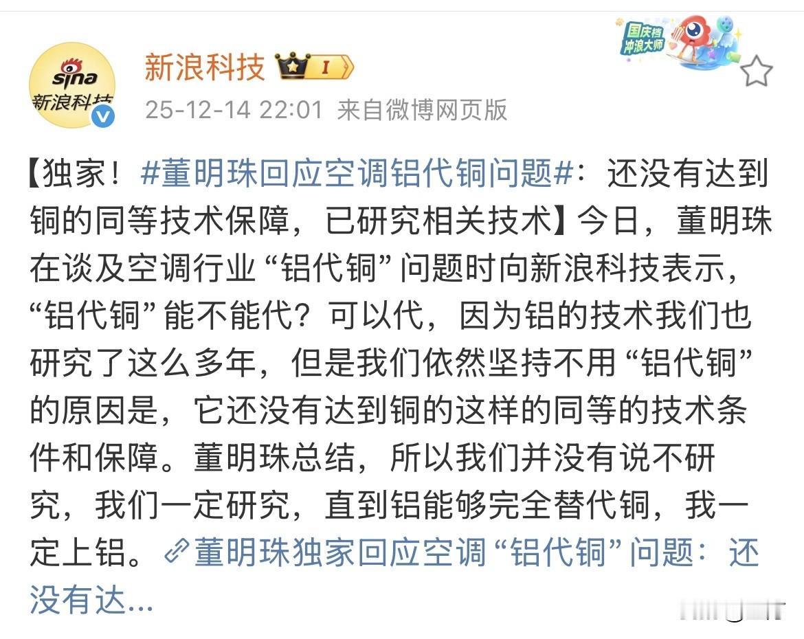 董明珠回应空调铝代铜问题: 还没有达到铜的同等技术保障,已研究相关技术 今天晚上,董明珠接受了新浪科技的独家采访,专门谈到了这个比较专业的问题。 董明珠在这个行业算是比较专业的了,所以她在接受采访的时候这个问题比较严谨 ,她表示目前这个事情其实还可以做,但是没有达到他们想要的效果,所以他们自始至终都还没有做。 因此,他们现在还在继续进一步的加大研发,她也希望有一天真正的能够实现铝代铜。 也就是说,从她的描述里面能够听得出来,这两个材料之间的替换,其从将来的科学发展来看是可以实现的,但是现在如果要做的话也能够做得出来,可是没有达到他们想要的那种完全替代的水平和标准。 因此,他们才没有用这个方案,也就是说在现阶段 ,现有的这个技术水平上,他们的产品该用铝材的地方用铝材,该用铜材料的地方依然用的是铜材料,并没有做一个替代的方案。 所以他们在这个行业 算是比较资历和研究的比较较深的,如果他们都还没有突破这个技术瓶颈,同行就先行的使用铝制材料,替代铜材料,可能在某种程度上,不是被她认可的。