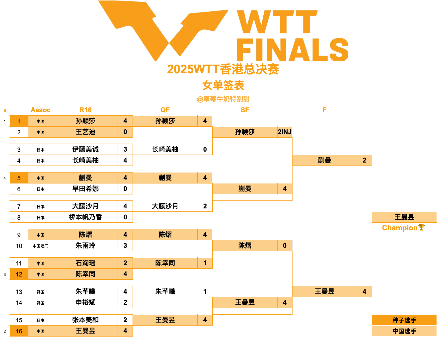 2025WTT香港总决赛丨女单决赛王曼昱🇨🇳4-2蒯曼🇨🇳【11-7,8-11,11-8,11-8,9-11,12-10】王曼昱🇨🇳获得2025WTT香港总决赛女单冠军🥇🎉蒯曼🇨🇳获得2025WTT香港总决赛女单亚军🥈