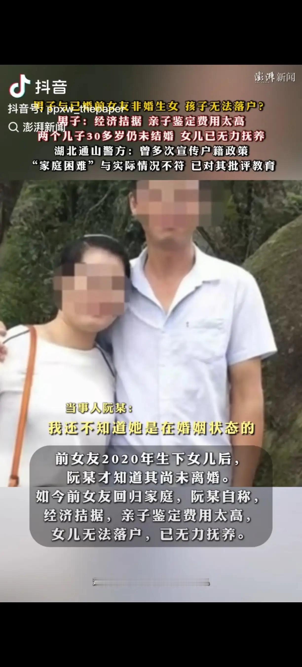 “湖北咸宁,53岁男子有两个30多岁的儿子尚未结婚,可他却和37岁女友生下一女,给孩子上户口时需要结婚证,女友才说出她已婚,和丈夫还没离婚,男子想等女友离婚后和她领结婚证,再给孩子上户口,结果,女友丈夫发现二人恋情,要告重婚罪,为此,男子与女友发生矛盾,女友干脆回丈夫家去了,男子提出让女友抚养孩子,他每月支付1500的抚养费,遭女友无情拒绝,男子无奈之下把女儿交给60多岁的哥哥帮忙抚养,一转眼孩子5岁了,还没落户,入学也成了难题…” 这名男子姓阮,他接受采访时坦言,直到2020年女友生下女儿后,自己才知晓对方还处于婚姻状态,此前女友一直隐瞒已婚事实,这让他陷入了两难的境地。阮某称自己打心底舍不得这个女儿,可家里本就不宽裕,两个三十多岁的儿子还没成家,经济压力早已让他喘不过气。 给孩子落户需要做亲子鉴定,可这笔费用对阮某来说如同天文数字,他以经济拮据为由迟迟没有办理,导致孩子5岁了依旧没有户口,连入学都成了奢望。他曾向外界哭诉自己家庭困难无力抚养女儿,可湖北通山警方核查后表示,其所说的“家庭困难”与实际情况不符,当地警方还曾多次向他宣传户籍政策,并对其进行了批评教育。 5岁的女儿对着大伯家的户口本,小手指着上面的名字,奶声奶气地问阮某:“爸爸,为什么没有我的名字呀?我什么时候能和小朋友一起上学?”这话让阮某红了眼眶,却又说不出一句能兑现的承诺。他舍不得将女儿送走,可现实的经济压力和落户的难题,又让他陷入了深深的无力感中。 女友回归家庭后对女儿不管不问,阮某尝试联系对方协商孩子的抚养和落户问题,却始终得不到回应,如今他只能靠着年迈的哥哥帮忙照顾女儿,而孩子的未来,还笼罩在一片迷雾里。