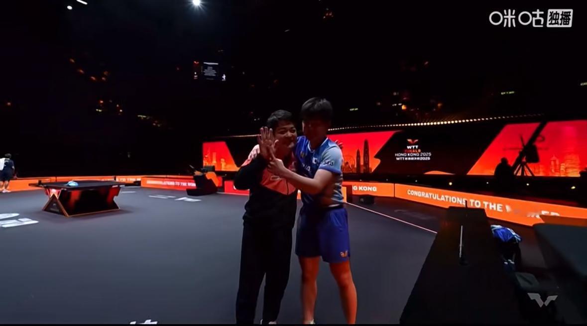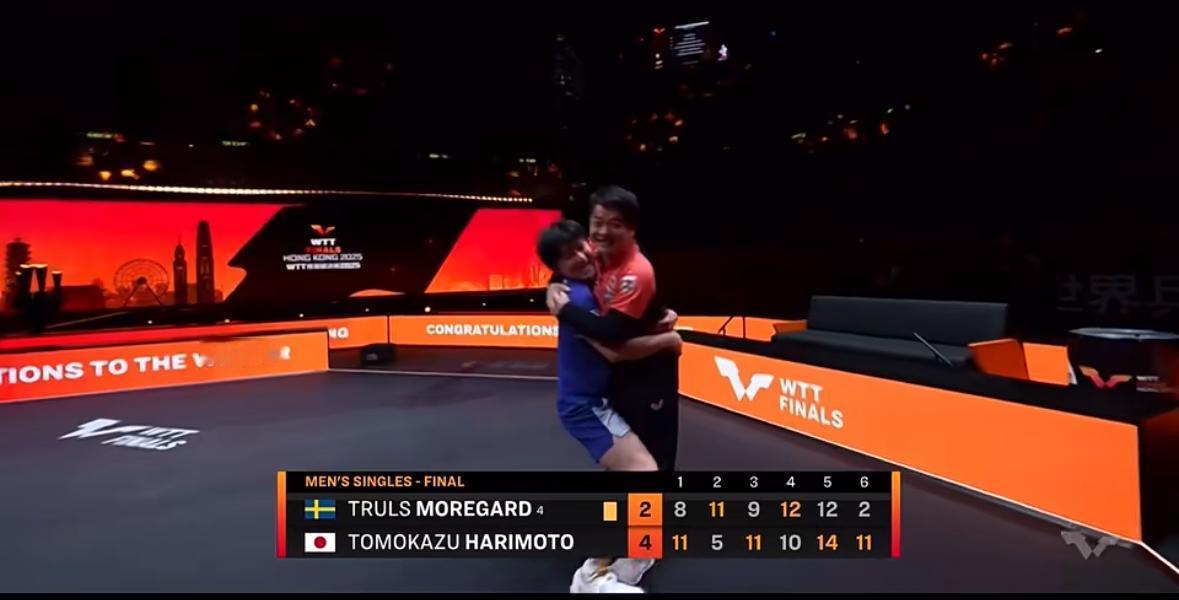张本智和夺冠后又模仿东哥的庆祝动作——抱起教练兴奋不已 张本智和在赛前多次强调 这场总决赛必须夺冠, 这个大漏真的让他捡到了, 王楚钦因伤退赛, 莫雷加德决胜局心态崩了, 张本智和在赛后采访中嘚瑟表示: “我三次晋级到总决赛亚军, 事不过四, 这次终于成功夺冠, 这也是我第一次夺得总决赛冠军, 为我的2025有一个完美的结尾, 希望我带着这份美好 冲进2026……” 张本在对粉丝说话时考虑一下语言 最后“I love you” 结束!