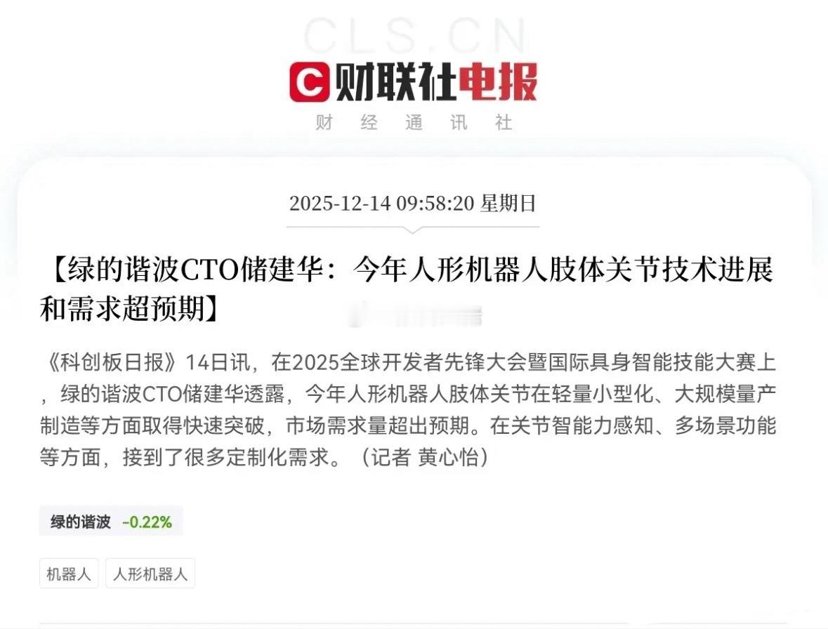 人形机器人起飞!周末人形机器人利好消息火上浇油了!不出意外的话,明日人形机器人有望成为市场最火概念,持有的股民们恐怕要笑出声了吧…利好一、《科创日报》14日消息,松延动力与慧辰股份达成了1000台人形机器人签约订单,此次松延动力推出的“小布米”人形机器人定价9998元,一口气下单1000台,足以证明人形机器人市场需要足够大,大规模商业化后,人形机器人厂商将释放巨大的盈利潜力利好二、《科创日报》14日消息,据2025年全球开发者先锋大会暨国际具身智能技能大赛上,绿的谐波透露,今年人形机器人肢体关节技术进展和需求超预期,这对于机器人产业是大利好,技术突破叠加需求大爆发,足以说明当前人形机器人产业景气度高!股民们!坐稳扶好!宇树科技、绿的谐波、松延动力周末纷纷发布利好,明日人形机器人要火了!