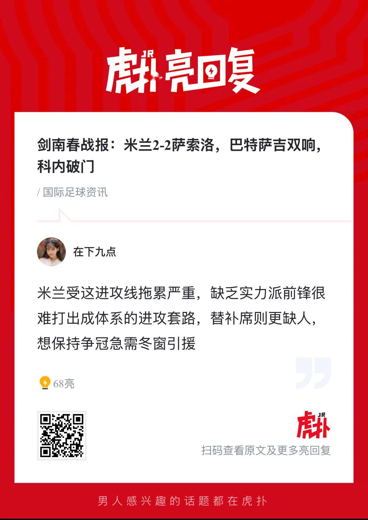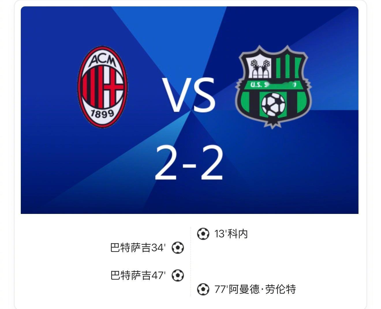 【战报:米兰2-2萨索洛,巴特萨吉双响,科内破门】上半场科内闪击破门首开纪录,随后奇克助攻巴特萨吉破门打进处子球。下半场一开场巴特萨吉破门梅开二度,随后普利西奇补射破门被吹,拉比奥破门因越位被吹,劳伦特替补登场破门扳平比分。