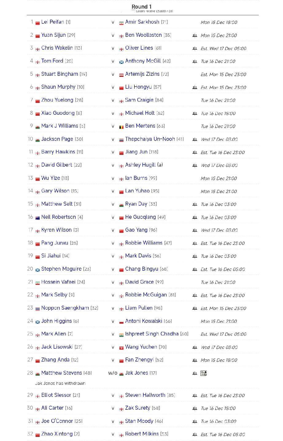 11名中国球员登场 2025斯诺克苏格兰公开赛12月15日赛程! 正赛首轮64进32轮次,7局4胜赛制。 18:00 : 雷佩凡 vs 阿米尔·萨克霍什 张安达 vs 范争一 21:00: 袁思俊 vs 本·沃拉斯顿 吴宜泽 vs 伊安·伯恩斯 加里·威尔逊 vs 蓝裕豪 23:00 肖恩·墨菲 vs 刘宏宇 16日3:00: 尼尔·罗伯逊 vs 国强 斯佳辉 vs 马克·戴维斯 16日5:00 赵心童 vs 罗伯特·米尔金斯 斯蒂芬·马奎尔 vs 常冰玉