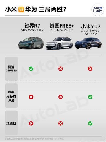 三局两胜,小米辅助驾驶赶上华为了? 来看看小米YU7以及搭载华为乾崑ADS 4的智界R7、岚图FREE+在这三大场景中的表现。 上海北横通道: ·小米YU7未通过,未汇入正确入口 ·岚图FREE+未通过,未汇入正确入口 ·智界R7通过 狭窄无标线乡道: ·岚图FREE+未通过,半途降级 ·智界R7未通过,下桥洞后没及时右转进入狭窄乡道 ·小米YU7通过 地道口: ·智界R7 ,错误驶入地面。 ·岚图FREE+ ,错误驶入地面 ·小米YU7 ,成功驶入地道。