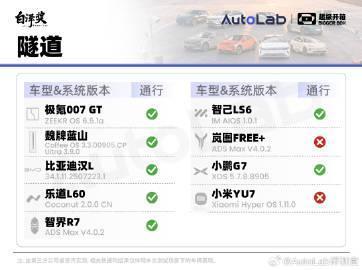上海北横通道全长超过3公里,地下为主、高架为辅。进出这段路会受光线明暗变化影响,且汇入口距离短,考验传感器的适应性以及系统的决策速度,地下定位信号也弱。 接触辅助驾驶比较早的朋友们大概会知道,以往北横通道是各家领航辅助的降级重灾区,而这次九台车,有七台车都成功通过了地道。 岚图FREE+和小米YU7都因为错误走成了地面,没完成通行。