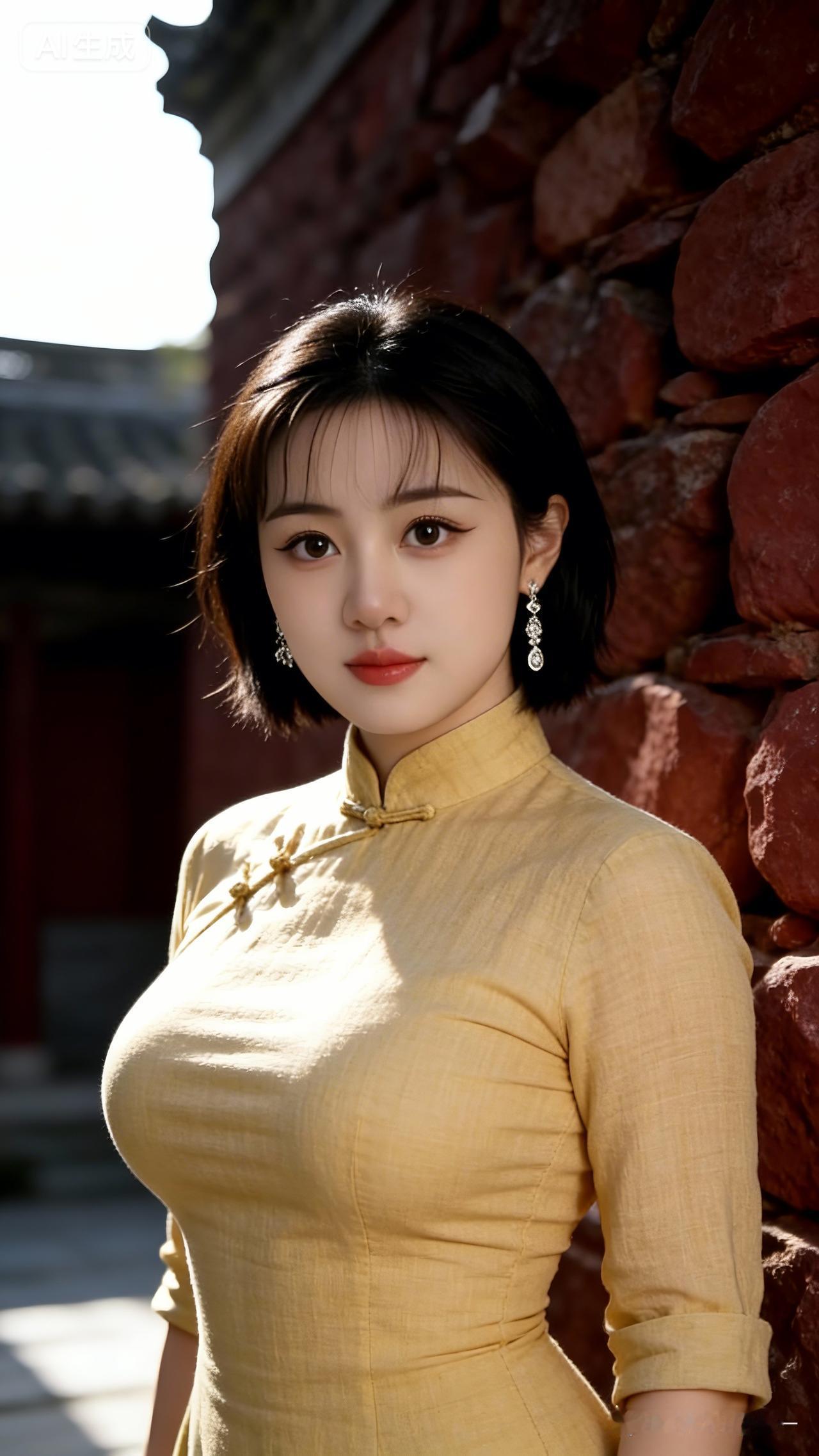 优雅旗袍少女,红墙映衬,古典韵味十足