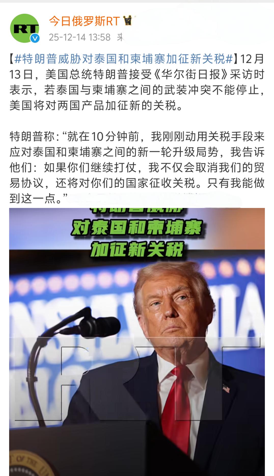 这就打脸了!特朗普说,若泰国和柬埔寨之间的武装冲突不能停止,美国将对两国产品加征新的关税;阿努廷说,没到停火时候。其实,不止是泰柬冲突再起,卢旺达与刚果(金)也在签署和平协议一个星期后急剧升级。所以,这是不给美国总统面子了?真把他惹急了,再加个150%的关税也不是不可能的!