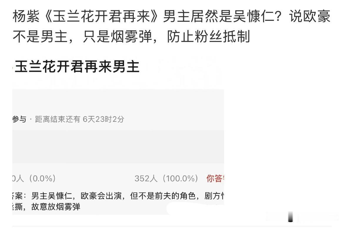 12月15日,杨紫《玉兰花开君再来》即将开机,凌晨突然有消息传出男主还是老吴! 假的!Tm早就说了老吴被杨紫团队否定了! 目前热门人选从黄轩,欧豪,变成了李现! 个人感觉三个人都不错,欧豪合作的概率更大,毕竟已经传他是男主很久了! 其他剧开机前一个月,别说男女主了,配角阵容就会出名单了,偏偏这部剧男主一直被揣测,左换右换,不过不要紧,25号前开机,不到10天,估计这周就能看到男主是谁