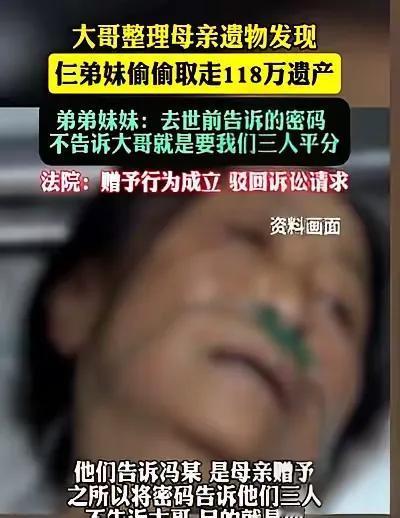 青海西宁,一男子照顾母亲多年,母亲去世后,男子发现其118万银行卡不翼而飞。不曾想,弟妹三人拿走银行卡,并一口咬定:母亲生前把银行卡和密码告诉他们,就是赠予他们,母亲说大哥条件好,故把他排除在外。男子不干了,将弟妹三人告上法庭。法院的判决让人意外。 冯大哥这些年对母亲晚年照顾有加,都是他守在身边。弟妹们各自有家庭和工作,逢年过节来探望一趟,坐一会儿就走,倒也落得清闲。老母亲走后,冯大哥整理遗物时翻遍了家里,也没找到那张存着母亲毕生积蓄的银行卡,心里咯噔一下,赶紧去银行查,才知道卡里的118万早就被分三次取空了,而取款人正是自己的三个弟妹。 找到弟妹对质时,对方的话让冯大哥心凉半截。三人异口同声说,母亲去世前特意把银行卡密码告诉了他们,还明说这钱就是留给兄妹仨分的,特意没告诉大哥,是觉得他做生意赚了钱,日子过得比他们都好,没必要再分这份遗产。这话听着像模像样,可冯大哥怎么都不信,母亲生前从没跟他提过这事儿,况且自己尽心尽力照顾这么多年,不说多分,总该有一份吧?一气之下,他把弟妹告到了法院,想着靠法律讨个公道。 可法院的判决结果,却让冯大哥彻底懵了。法官审理后认为,母亲生前主动将银行卡密码告知弟妹三人,且实际交付了银行卡,这种行为构成了赠与,并非遗产继承的范畴,最终驳回了冯大哥的诉讼请求。这个结果一出来,不光冯大哥想不通,不少听说这事儿的人也觉得别扭。 说到底,这事最让人纠结的地方,就在于“赠与”的认定太模糊了。老母亲只是说了密码、给了卡,既没有书面的赠与协议,也没有无利害关系的见证人,单凭弟妹的一面之词,法院就认定赠与成立,实在让人难以信服。更何况,冯大哥是实际履行赡养义务的人,按照公序良俗,就算母亲真的想偏心,也该考虑到儿子多年的付出。弟妹们拿着钱的同时,却对兄长的付出视而不见,这份亲情在金钱面前,显得格外单薄。 更让人觉得不是滋味的是,现实里不少家庭都有这样的情况:有人默默承担赡养老人的责任,有人只在需要分好处时才出现。法律上的认定或许有其依据,但人情上的天平,早就偏向了那个付出更多的人。母亲的心意到底是什么,恐怕只有她自己知道,可弟妹们借着“母亲的意思”拿走全部钱款,却让多年的手足情分碎了一地,这笔账,远比118万更让人痛心。 各位读者你们怎么看?欢迎在评论区讨论。
