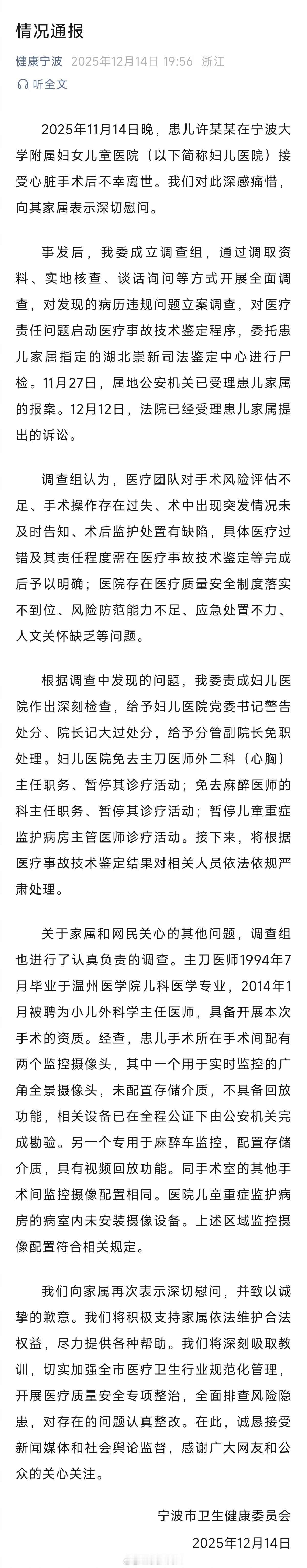 宁波通报患儿手术后离世主刀医生陈某贤被实名举报2025年6月在同院主刀同类手术致13月龄婴儿死亡,两起事件存在术前承诺高成功率、手术超时、二次操作未告知等高度相似操作。请严惩!!!