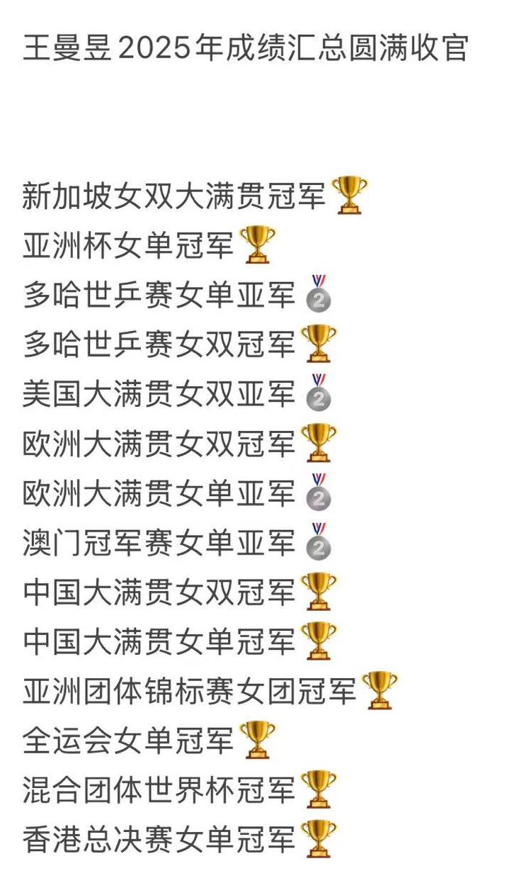 王曼昱2025年成绩汇总—圆满收官 12月14日王曼昱夺得香港总决赛 女单冠军,圆满结束了 2025年所有国际赛事, 2025年,王曼昱是收获的一年, 一共收获了10个冠军, 其中夺得单打冠军4次, 双打冠军6次! 5场2000积分的女双, 全运会卫冕冠军, 总决赛卫冕冠军, 亚洲杯冠军, 总决赛冠军, 大湾区战神, 10冠4亚,曼昱太牛啦! 北京大满贯冠军🏆,背靠背 三站比赛的冠军! 2025年王曼昱辛苦啦…… 好好休息,好好调整, 奔赴美好的2026年吧!