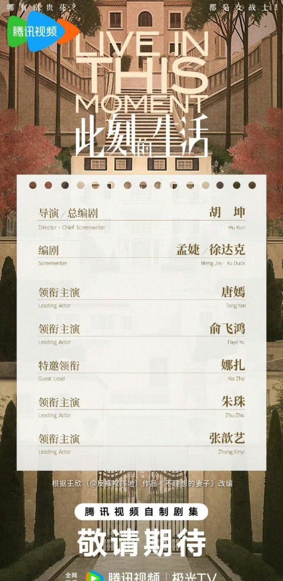 电视剧《此刻的生活》开机招商领衔主演:唐嫣、俞飞鸿、娜扎、朱珠、张歆艺播出平台:
