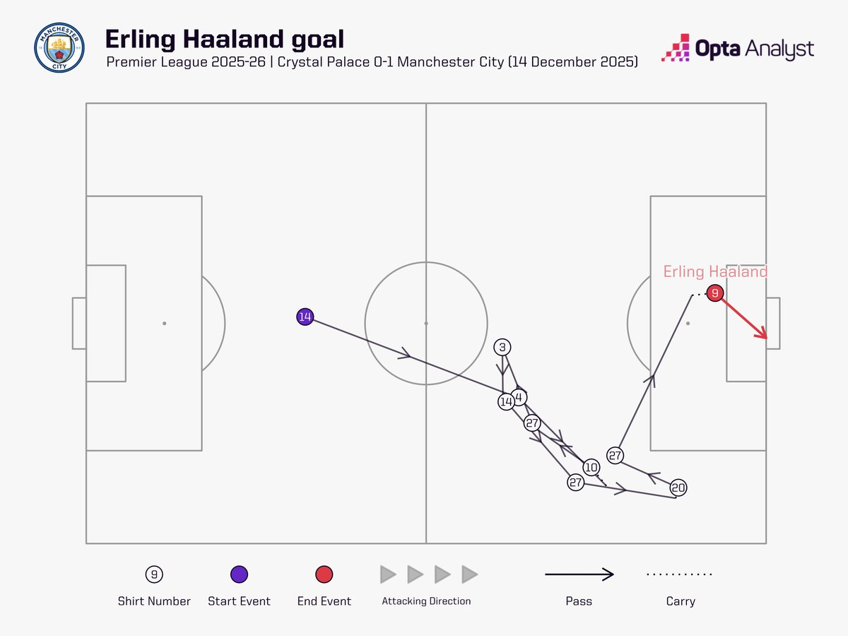 曼城在第41分钟完成了第二次射门,而这几乎注定会是埃尔林·哈兰德的进球,这是哈兰德本场比赛的第九次触球,这位挪威进球机器帮助曼城在塞尔赫斯特公园球场取得了领先