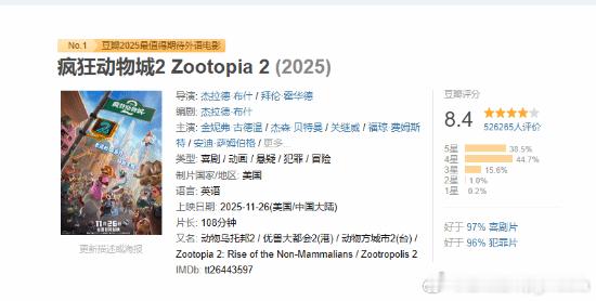《疯狂动物城2》票房突破35亿据灯塔专业版实时数据,截至今天13时56分,影片《疯狂动物城2》票房突破35亿豆瓣数据显示,该片开分为8.7分,目前评分已降至8.4分,参与评分人数超过52万。其中,4星评价占44.7%,5星评价占38.5%。在热门影评中,有观众直言:“放再多梗和彩蛋也改变不了主线平庸的事实,第一部用非常完整的世界观讨论了偏见和歧视等社会议题,抛开隐喻以外剧情也非常扎实惊艳,时隔九年续集只能达到及格的话还蛮令人失望的。”作为2016年《疯狂动物城》的续作,《疯狂动物城2》延续了朱迪与尼克这对经典搭档,讲述二人携手调查神秘爬行动物盖瑞所引发城市危机的故事。影片由拜伦·霍华德与杰拉德·布什联合执导,杰拉德·布什编剧,杰森·贝特曼、金妮弗·古德温、关继威、夏奇拉、昆塔·布伦森等配音。