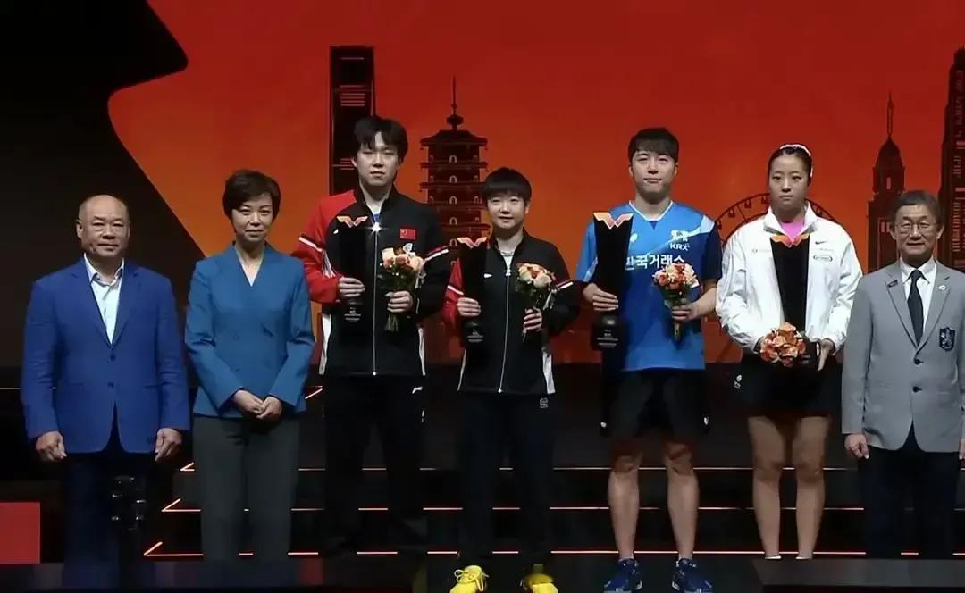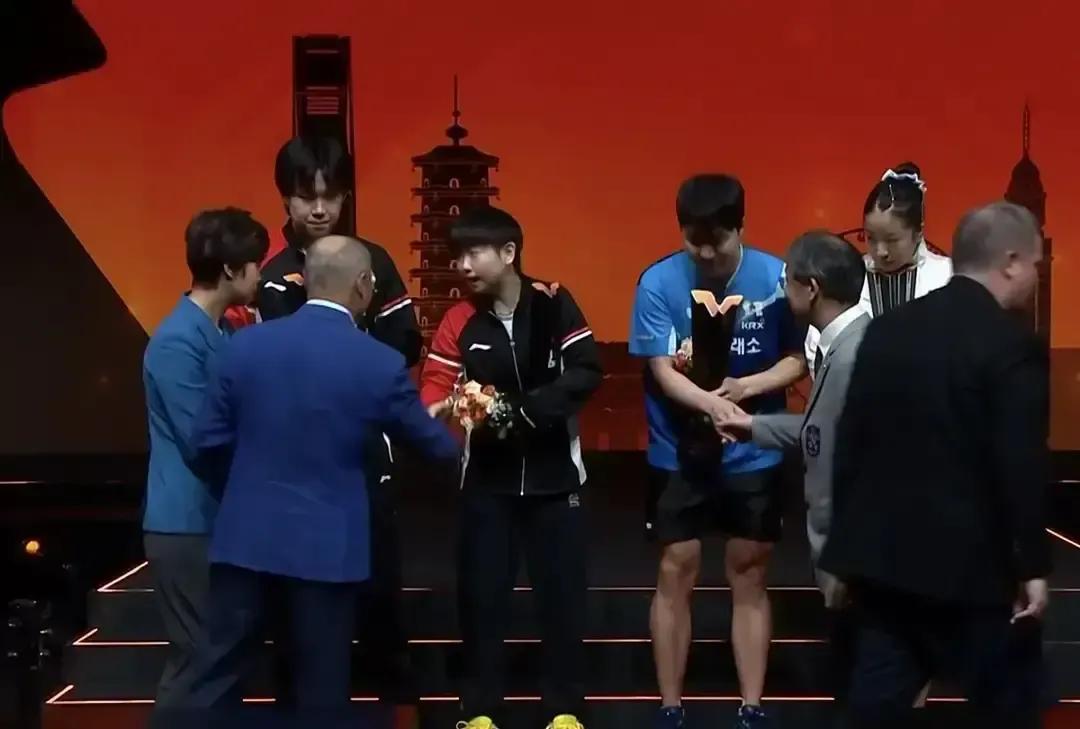 孙颖莎决赛那天右肩贴着肌贴,发球动作明显发紧,还是咬牙打满六局,最后2比4拿亚军。 颁奖礼上李宁突然走过去,先拍拍她胳膊,再双手握手,低头说了两句,莎莎笑着点头,镜头扫过那一秒,全场掌声比给冠军还响。 我看报道说老头儿平时极少露面,这次特意飞新加坡,就为了给她递个“别怕,有后台”的眼神。 带伤上场没赢,却换来前辈一句肯定,比奖杯更沉。 老冠军给小冠军撑腰,这就是传承。 拼到受伤还站那儿领奖,配得上所有尊重。