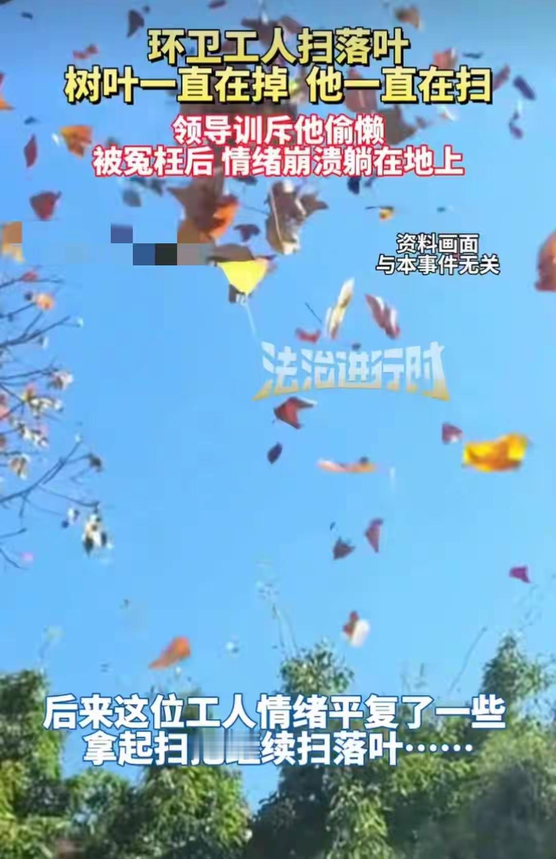 沈阳街头的一幕,让无数网友破防了。 一位穿着橙色背心的环卫工大叔,正蹲在满是黄叶的路边捂着脸哭。没有争执,没有冲突,只因为领导一句“怎么又没扫干净”,就让这位日复一日与落叶较劲的老人,再也忍不住委屈的泪水。 他哪里是偷懒?北方深秋的杨树、梧桐树进入落叶高峰期,每平米地面一天就能堆积三五公斤落叶。大叔刚把路面清扫干净,一阵风过,新的落叶又簌簌落下,他就像在跟无形的风“打架”,扫了一遍又一遍,永远赶不上叶子飘落的速度。 这样的困境,并非个例。北方多数城市的环卫工人,在落叶季都要面临“超负荷作战”:每天工作12小时是常态,没有轮休,手里握着的还是老式扫帚,连省力的电动工具都少见。沈阳早在去年就承诺购置清扫车,可如今街头难觅踪影;即便有清扫车,老城区狭窄的巷子也根本开不进去,最终还是得靠人工一点点扫。 同样是落叶季,不同地方的应对方式截然不同。东京会专门划出区域保留落叶,立牌标注“这是自然的一部分”,让市民感受季节之美;北京不少小区则把落叶收集起来堆肥,实现“变废为宝”。而在我们身边,考核标准却只有“路面是否干净”——不看风有多大、叶子落得多密,不看环卫工人付出了多少汗水,只要肉眼可见有落叶,就被认定为“工作不力”。 网上流传着不少视频,镜头里的环卫工红着眼圈说“实在扫不动了”。有人不解,觉得这是“做样子”;更多人却心疼:风都懂得顺应季节规律,为何我们却要让劳动者对抗自然?我们总习惯用“勤快与否”评判他人,却忘了有些事,从来不是靠努力就能改变的。树叶飘落,是季节到了,不是环卫工没完成任务。 那位蹲在路边哭泣的大叔,周围落满了金黄的叶子,没人上前扶一把,没人说一句“辛苦了”。风还在吹,叶子还在落,他擦干眼泪,终究还是要拿起扫帚——只是这份辛苦,不该被一句轻飘飘的“偷懒”否定。 考核可以有标准,但更该有温度;要求可以有底线,但更该兼顾实际。希望每个城市在追求整洁的同时,也能给环卫工人多一份体谅,给自然规律多一点尊重。毕竟,真正的文明,从来不是对抗自然,而是懂得善待那些为生活拼尽全力的人。 免责声明:图文源于网络,版权归原作者所有,若侵权请联系小编删除。