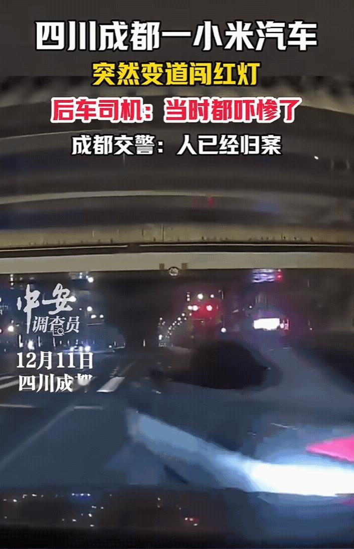 小米Su7凌晨撞两车后司机驾车逃逸在市区超速闯红灯差点再次发生严重事故。事发12月11日凌晨1点35分左右,在四川省成都市成华区杉板桥一段路,一辆小米Su7轿车严重超速闯红灯从排队车辆缝隙中穿过。 据视频了解,当时卿先生在看到红灯后缓慢刹车,就在即将到达停止线时,后面一辆小米汽车以极快的速度S型超车闯红灯,只差大概不足半米就发生碰撞,随后受到惊吓的卿先生将行车记录仪视频发布网络,希望警方对涉事车辆司机严惩。 随后记者联系当地交通管理部门成都市成华区交警队,表示已经介入此事,并对31岁司机邓某进行传唤,将依法处理。通过其他信息了解这辆小米汽车在之前几分钟因撞击两车后加速逃逸,慌不择路闯红灯危险驾驶,已经涉嫌严重违法犯罪。 成都一辆小米汽车超速闯红灯 凌晨严重超速闯红灯小米汽车司机被抓