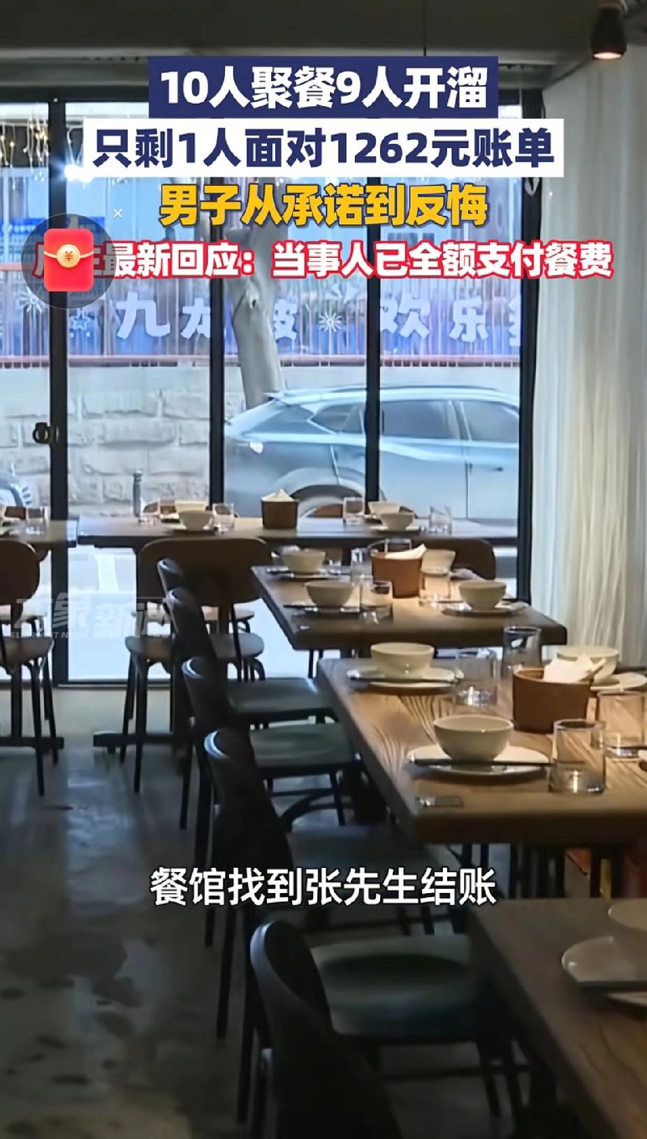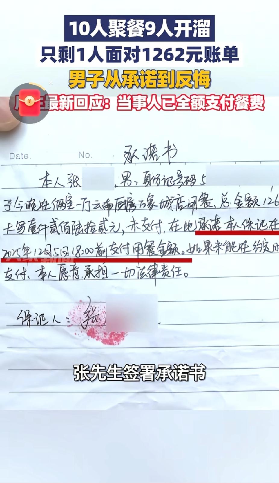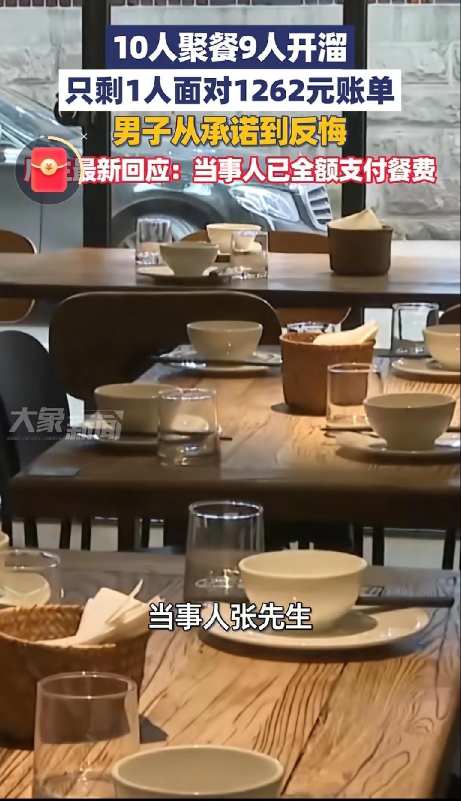 重庆10人聚餐9人集体“ 开溜”的事又有新情况了!唯独留下的张先生被餐馆起诉,这顿火锅的1262元钱,到底该谁来付呢? 一顿1262元的火锅吃得正热闹,可散场时却上演了“集体大逃亡”!监控画面拍到,9个人找各种理由溜之大吉,最后就剩下张先生一个人面对这1262元的账单。民警来调解后,他当场写了个还款承诺,结果过了一个星期,钱还是没到账。 律师的说法很明确:张先生既然主动签了还款承诺,那这顿饭钱就得他先垫付,之后再找那几个朋友要回来。网友们都炸开了锅:这哪是聚餐啊,简直就是“鸿门宴”!有人开玩笑说“重庆人不是最讲义气吗”,也有人觉得“老实人就活该被这样坑?” 餐馆老板叹气说:“我们是小本生意,一个月要是碰上两单这种跑单的事,基本就白干了。”目前法院已经立案处理,可张先生的电话一直没人接。 你身边有没有遇到过类似“吃饭跑单”的奇葩事儿?来评论区说说看~