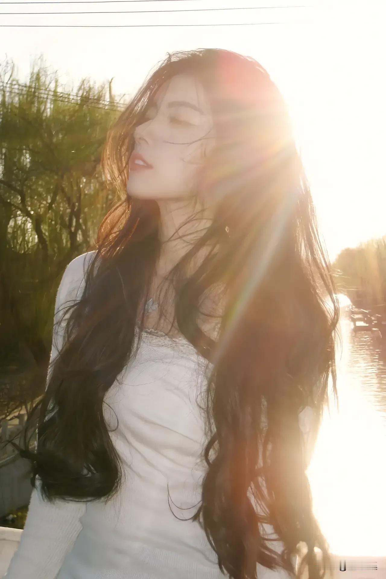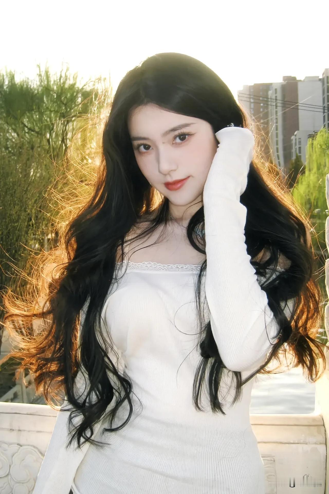 阳光下的温柔少女,黑发飘飘,白色连衣裙,清新自然。
