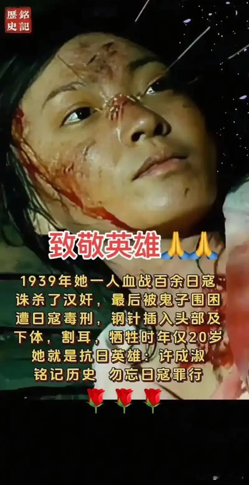 20岁姑娘血战百余日寇,遭鬼子变态酷刑不屈,她的壮举该被永远铭记! 1939年,她一人血战百余日寇,诛杀了汉奸,最后寡不敌众被鬼子围困,遭日寇毒刑,钢针插入头部及下体,割下耳朵,鬼子用尽一切变态手段折磨她……她牺牲时年仅20岁,她就是抗日英雄:许成淑! 咱先扒扒这姑娘的来头,许成淑是地道的朝鲜族姑娘,老家在吉林延边,打小就跟着家人听着鬼子的暴行长大,16岁那年就揣着一腔怒火加入了东北抗日联军,成了队伍里年纪最小的战士之一。别以为她年纪小就娇弱,抗联的苦日子早把她磨成了硬骨头,打枪、潜伏、侦察样样精通,战友们都喊她“小钢炮”——看着瘦,拼起来比爷们还猛。 1939年的东北,抗联的处境已经难到骨子里了,鬼子的“讨伐队”天天搜山,粮食弹药紧缺,不少战士连过冬的棉衣都没有。那天许成淑跟着小队执行任务,负责掩护大部队转移,可没想到刚到预定地点,就被汉奸出卖,一百多号鬼子像饿狼似的围了上来。小队队长当机立断,让当机立断,让许成淑带着3名伤员先撤,自己带着其他人断后,可没跑多远,伤员的动静就被鬼子发现了,许成淑咬咬牙,让伤员躲进山洞,自己提着一把步枪、揣着四颗手榴弹,硬生生朝着鬼子的方向冲了过去,她要把鬼子引开! 你敢信吗?一个20岁的姑娘,就凭着地形熟悉,在山林里跟百余日寇玩起了“捉迷藏”。她趴在树后,瞅准机会就放一枪,每一枪都能撂倒一个鬼子,鬼子被打得晕头转向,以为遇到了大部队,不敢贸然前进。可架不住鬼子人多,慢慢缩小了包围圈,许成淑边打边退,子弹很快就打光了,她掏出腰间的砍刀,趁着鬼子靠近的间隙,一刀劈倒了冲在最前面的一个鬼子小队长。 这时候那个汉奸跳了出来,指着许成淑的藏身之处大喊“她没子弹了!”,就是这一声喊,让许成淑陷入了绝境。鬼子蜂拥而上,许成淑拼尽全力反抗,又砍伤了两个鬼子,可最终还是被鬼子按在了地上。她看着那个汉奸,眼里都要冒火,趁着一个鬼子不注意,猛地挣脱开来,一口咬掉了汉奸的耳朵,疼得汉奸嗷嗷直叫,鬼子见状,对着她的脸狠狠踹了几脚,才把她制服。 鬼子原以为能从她嘴里掏出抗联的下落,可没想到这个年轻姑娘骨头这么硬。一开始还假惺惺地劝降,许成淑直接吐了鬼子一脸唾沫,骂道“你们这些强盗,早晚有一天会被赶出中国!”。鬼子被惹急了,开始用酷刑折磨她,先是用皮鞭抽,打得她浑身是血,可她还是骂不绝口。鬼子见软的硬的都没用,就拿出了钢针,一根一根插进她的头部和下体,疼得她浑身抽搐,可她硬是没吭一声,反而瞪着鬼子,眼神里全是不屈。 后来鬼子又割掉了她的耳朵,把她绑在树上暴晒,可许成淑始终没有透露任何关于抗联的信息。直到最后,鬼子知道从她嘴里得不到任何东西,就残忍地杀害了她,年仅20岁的生命,永远定格在了那个残酷的年代。 可能有人会说,一个小姑娘,何必这么拼?可你想想,在那个国破家亡的年代,正是因为有许成淑这样千千万万的年轻人站出来,用血肉之躯挡住鬼子的刺刀,我们才有了今天的和平。她不是不怕疼,不是不怕死,只是她心里清楚,身后是战友,是乡亲,是祖国的山河,她不能退,也退不起。 再看看那个汉奸,为了一点蝇头小利,就背叛自己的国家和同胞,最后落得个耳朵被咬伤的下场,反观许成淑,用生命诠释了什么叫民族气节,什么叫宁死不屈。现在很多人天天刷着短视频,追着明星,可对于许成淑这样的英雄,却知之甚少,这真的不应该。 英雄不分年纪,也不分民族,许成淑用20年的人生,写下了最壮烈的爱国篇章。她的遭遇让人痛心,她的勇气让人敬佩,这样的英雄,值得我们永远铭记,值得我们一代代人缅怀。 各位读者你们怎么看?欢迎在评论区讨论。