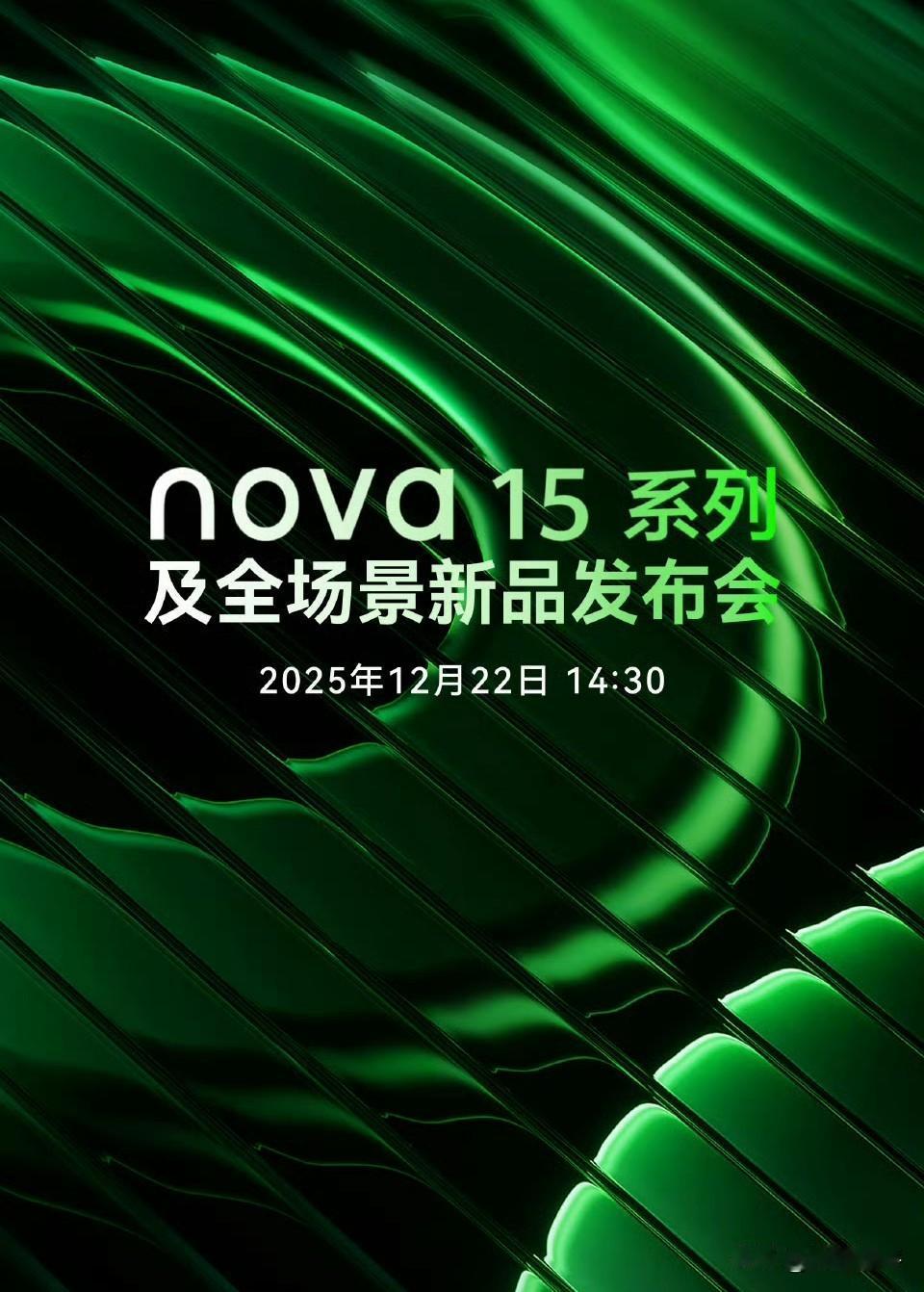 Nova15系列官宣22号发布!节奏真快!依旧是三款机型版本,看海报有没有可能绿色是主打色,博主还爆料这次Nova的货管够[灵光一闪]标准版依旧搭载8020处理器,Pro不确定会不会上麒麟9系,但大概率还是麒麟8系,明年Nova16Pro可能才上麒麟9系处理器,看看Nova这次降价多少[思考]