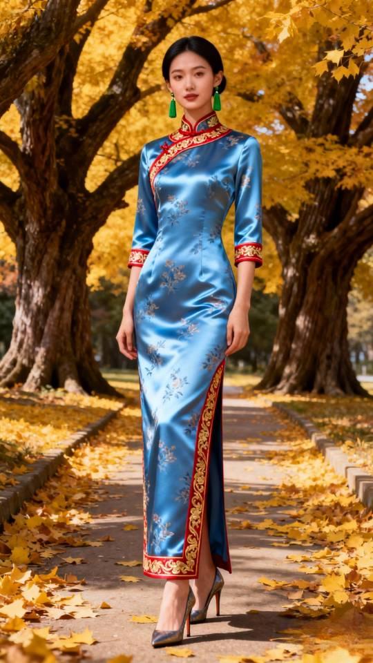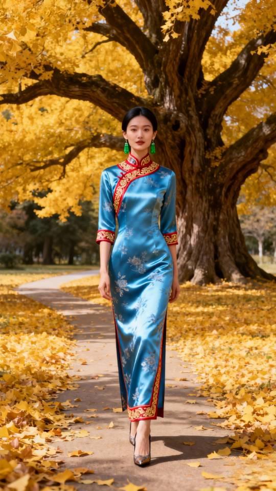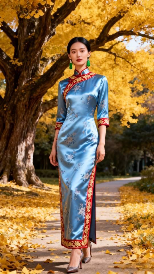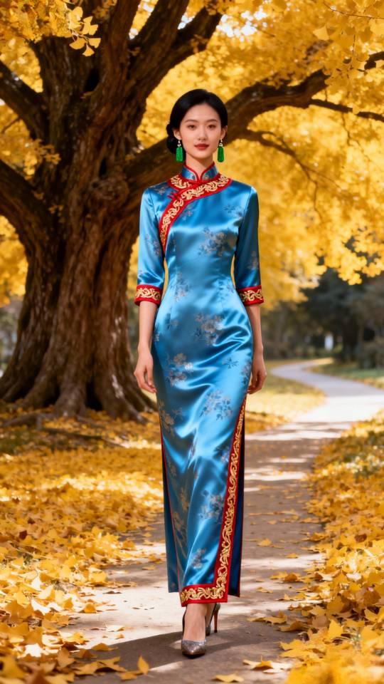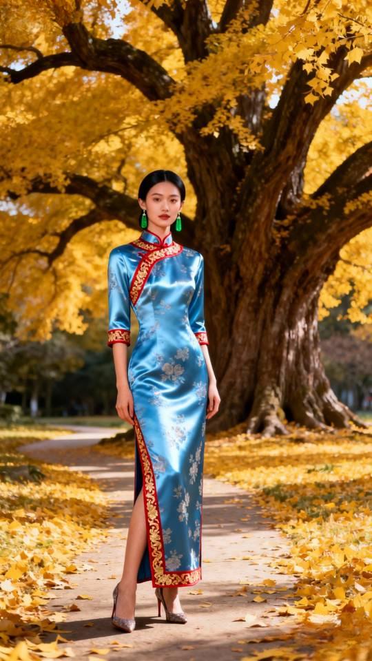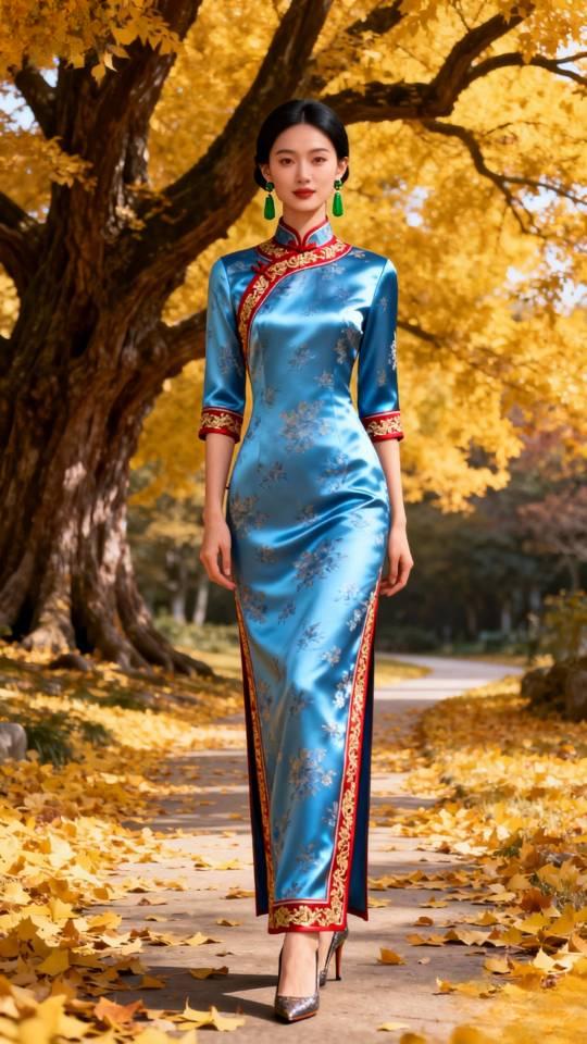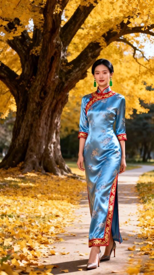 蓝色长旗袍女子杏树下摆拍。旗袍 户外景点旗袍秀 旗袍漫步秋景 旗袍美人像
