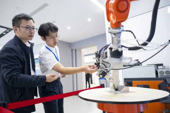 11月6日,在武汉产业创新发展研究院,工作人员展示增材制造机器人。新华社发