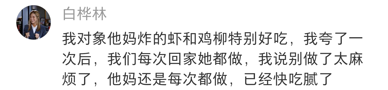我夸了一次后,我们每次回家她都做,我说别做了太麻烦了,他妈还是每次都做,已经快吃腻了