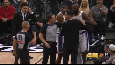 詹姆斯喷过迪龙喷裁判,势有干仗的意思。迪龙滋扰詹姆斯数次,这一次球还砸到了身上,老詹忍无可忍,抓住裁判理论,结果吃了一T,迪龙已经5次犯规了。 迪龙是联盟中众所周知的刺头,专挑对方箭头人物干,但一不小心就上了他的当。 比赛刚刚进入第三节,目前两队比分胶着,激烈程度可想而知。詹姆斯15分,迪龙10分,东契奇24分。