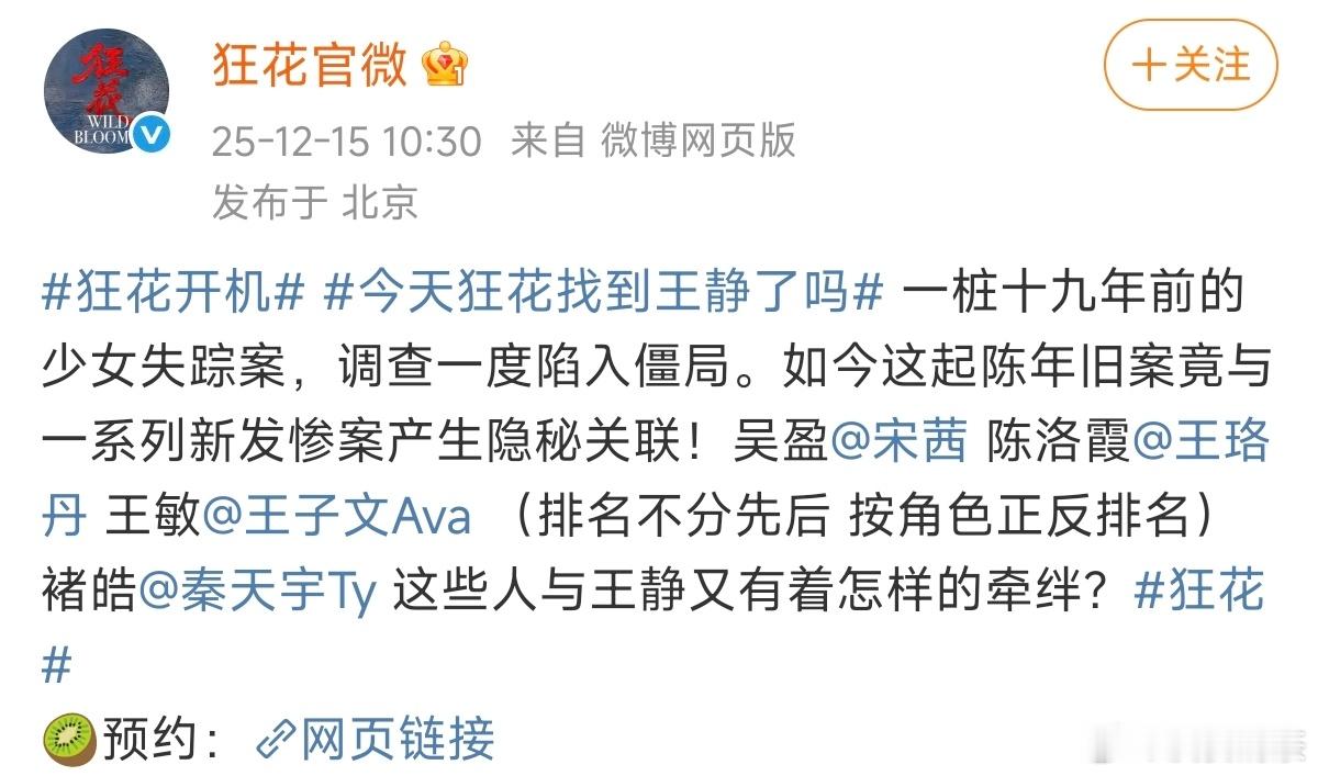 狂花开机1. 宋茜/王珞丹/王子文 (3人平番)2.男主秦天宇,1993,北