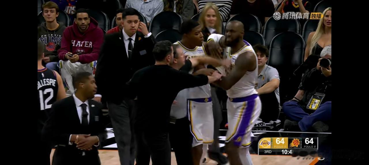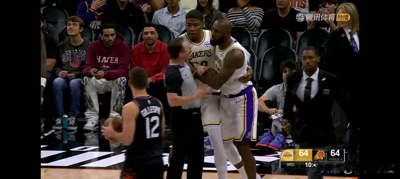 狄龙上篮被詹姆斯大帽,随后詹姆斯朝着狄龙狂喷,裁判过来,狄龙眼看目的达到了就躲了!结果詹姆斯又对裁判一顿输出! 詹姆斯罕见愤怒!看来是真被狄龙惹急眼了!直接冲着裁判大骂,八村垒护住詹姆斯,詹姆斯也吃了一个技术犯规! 看来这俩人对位这将是贯穿全场的争端!