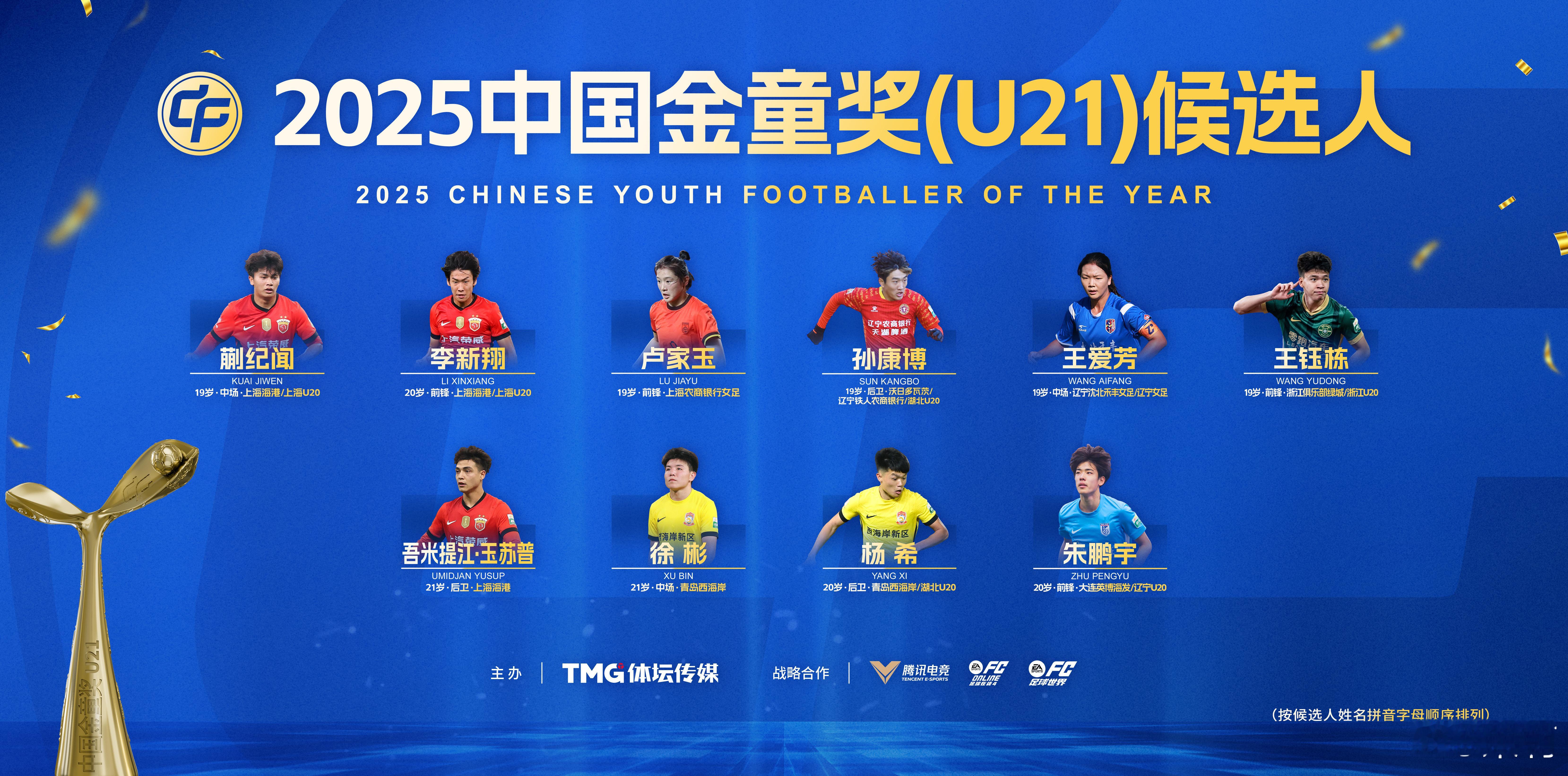 第9届中国金球奖2025中国金球奖评选开启恭喜深圳新鹏城球员拜合拉木入选金球奖候选人拜合拉木在今年国字号队伍的比赛中高效破门,表现抢眼,共打进7球。在国足层面,3月对阵科威特的闭门友谊赛中破门;U23亚洲杯预选赛里3场打进4球;熊猫杯赛事中出战2场打进2球,其中在对阵韩国U22的比赛中梅开二度,助力球队2 - 0取胜。其他赛事:拜合拉木在今年年初的省港杯比赛中还有1球1助攻的贡献,助广东队夺冠!今年的金童奖(U21)毫无悬念应该颁给王钰栋吧,这是最没有争议的一个奖项了。金帅奖,我心目中的最佳还是于根伟指导。金手套奖,嗯,我选颜骏凌!