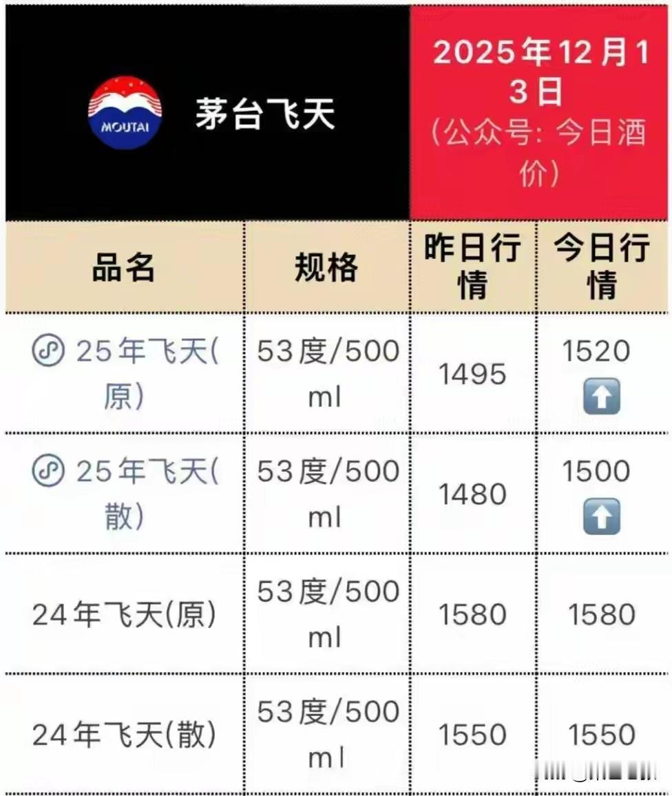 近期,飞天茅台价格走势犹如坐过山车。第三方平台“今日酒价”数据显示,12月12日,2025年53度500ml飞天茅台原箱和散瓶批发价均跌破1499元官方指导价。随后价格大幅回升,12月14日,散瓶批发参考价涨至1570元/瓶,原箱产品报价1590元/瓶,较12日分别回升85元、95元。 今年高端白酒批价下行,行业深度调整。此次茅台价格反弹,据说与贵州茅台控量政策有关,可见该举措效果显著。后续价格走向值得持续关注。