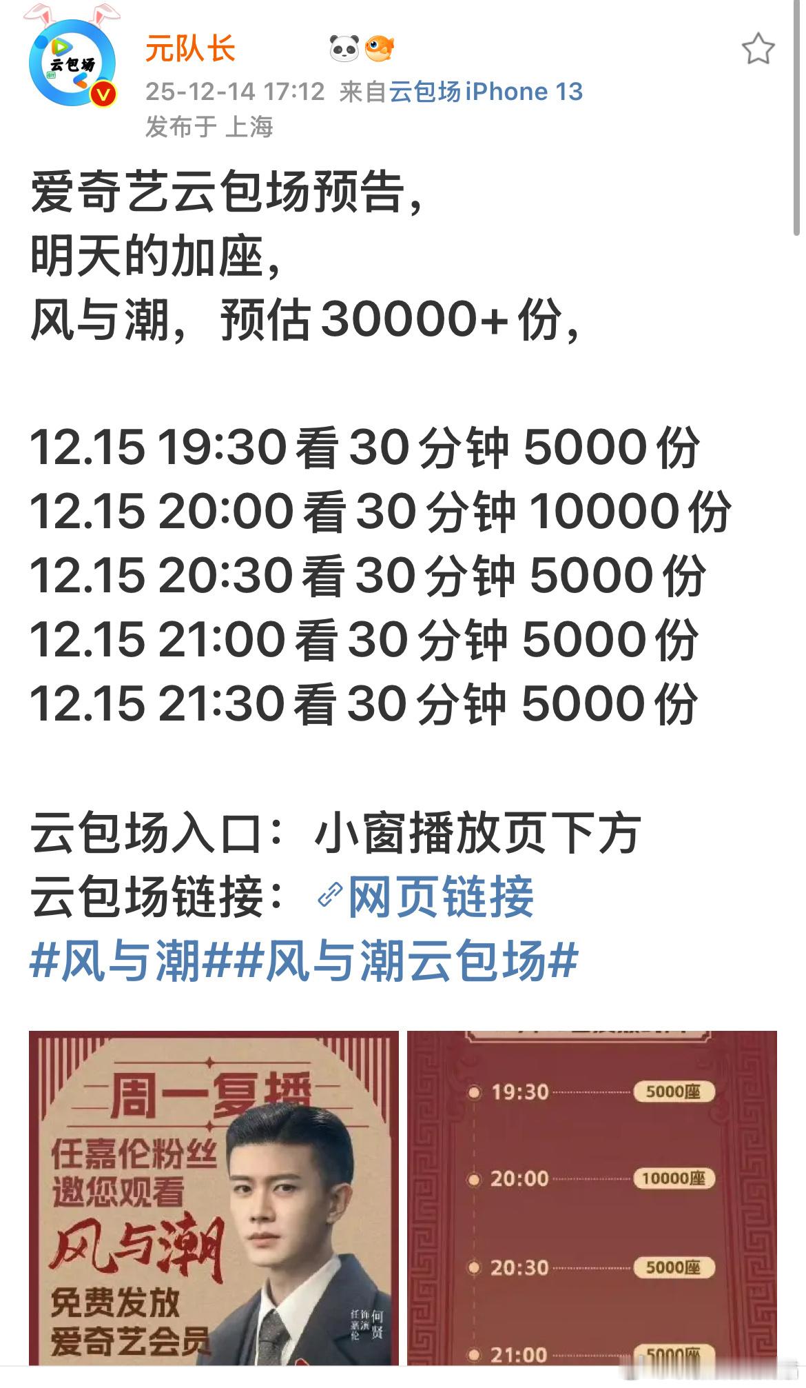 《风与潮》播出首周收视战报,成绩喜人:首周cvb破3,央一下半年Top1, cvb拉升全年Top1!新一周的追剧日历:周一到周四更新两集,周五更新一集!还有新的云包场可以领!任嘉伦风与潮