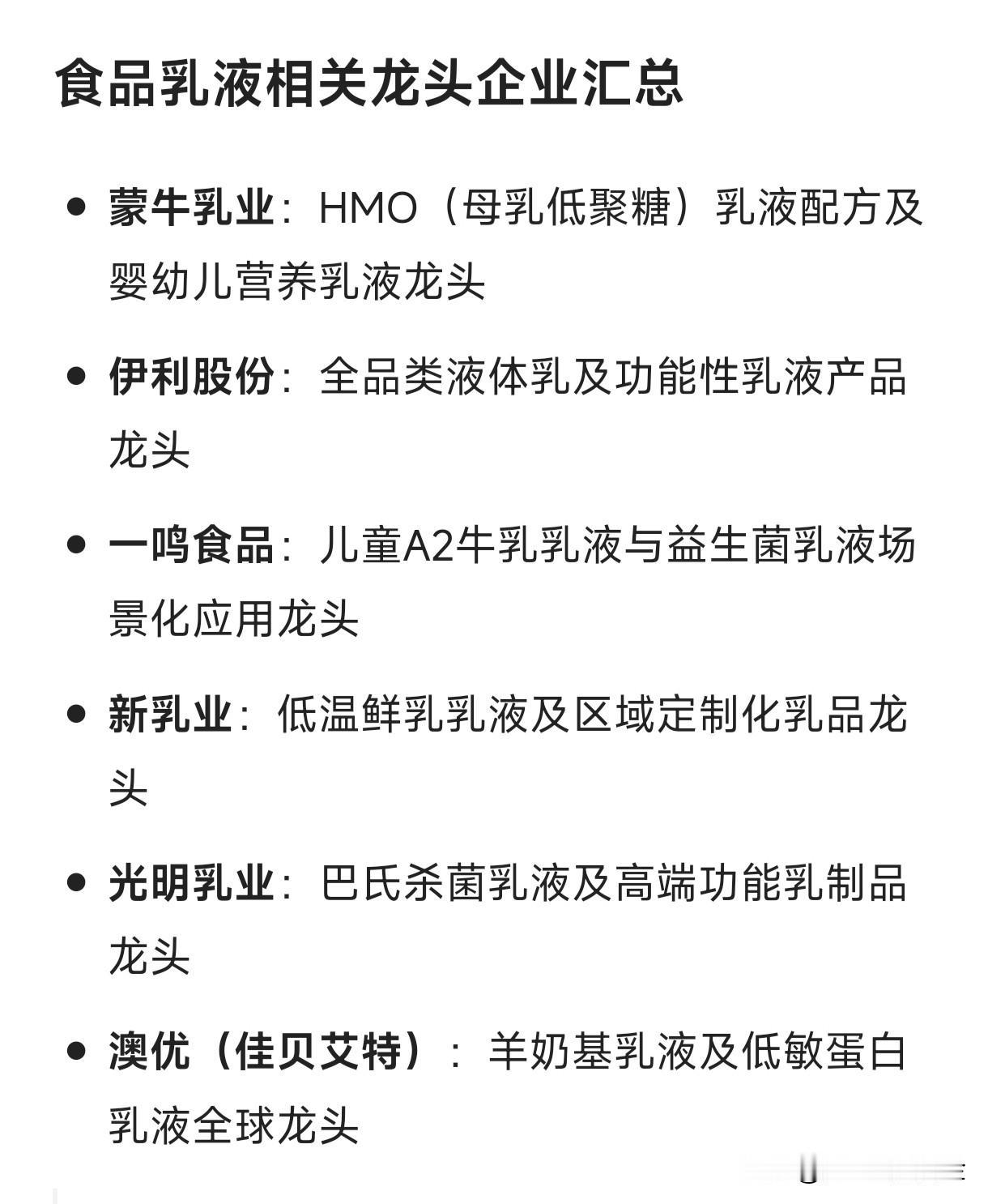 食品乳液相关龙头企业汇总 蒙牛乳业:HMO(母乳低聚糖)乳液配方及婴幼儿营养乳液龙头 伊利股份:全品类液体乳及功能性乳液产品龙头 一鸣食品:儿童A2牛乳乳液与益生菌乳液场景化应用龙头 新乳业:低温鲜乳乳液及区域定制化乳品龙头 光明乳业:巴氏杀菌乳液及高端功能乳制品龙头 澳优(佳贝艾特):羊奶基乳液及低敏蛋白乳液全球龙头