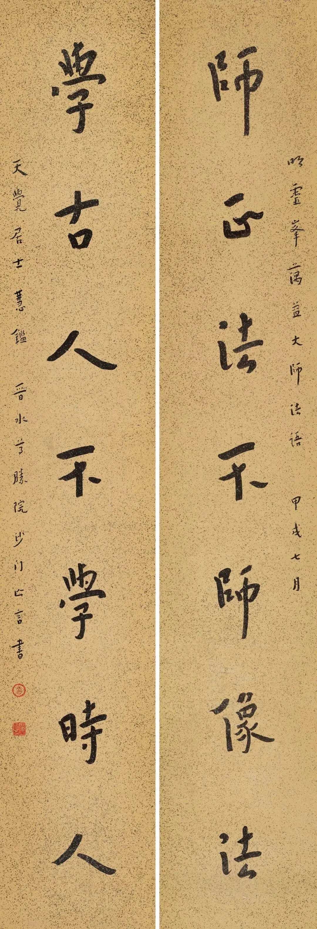 弘一 行书《师正学古七言联》。镜心 水墨洒金笺 135.5×23.5 cm。释文: 师正法不师像法,学古人不学时人。这就是中国风遇见艺术