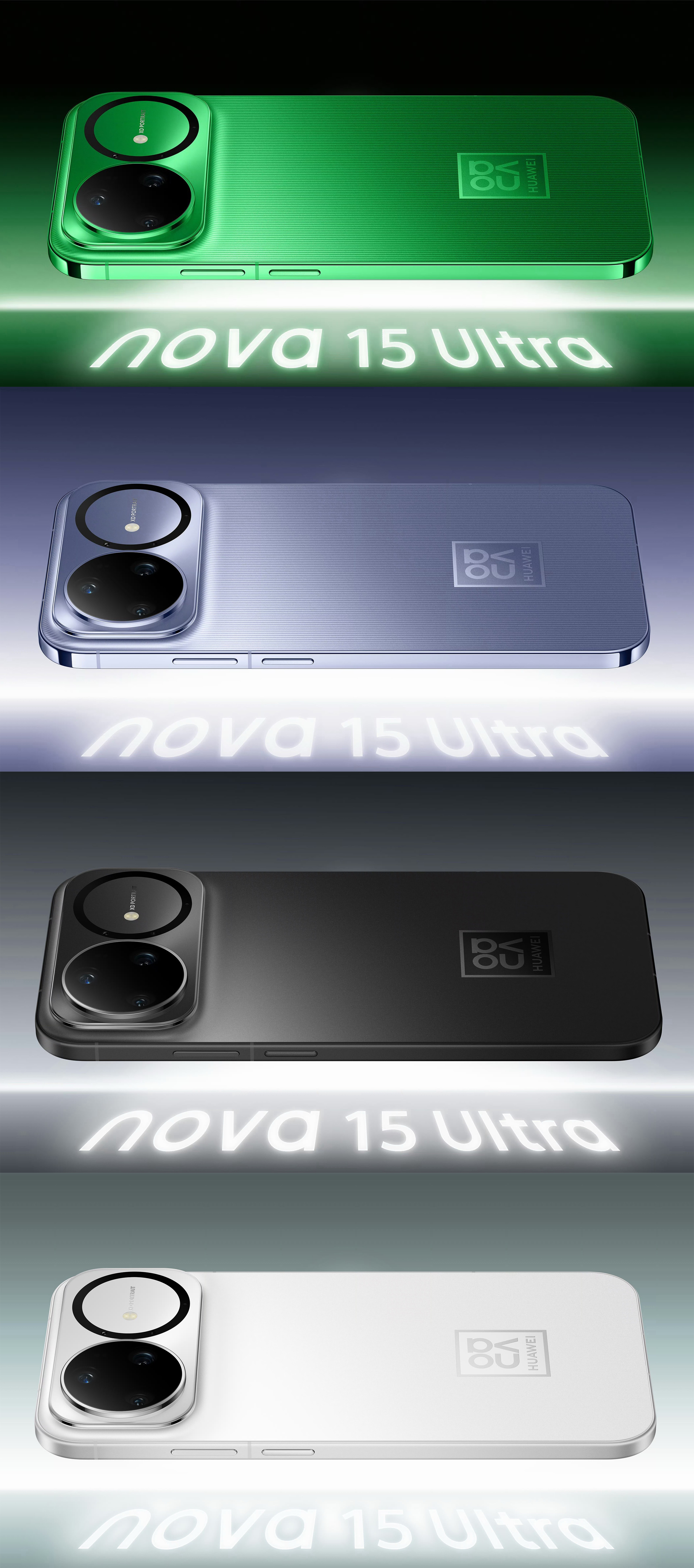 四款Nova15Ultra配色,我还是喜欢白色,磨砂金属中框,紫色和绿色的金属中框是亮色,DECO也是横置设计留出更大的电池空间,双环8设计,传承了Mate系列的设计语言,左边环三摄镜头、右边环红枫镜头、手机看起来也轻薄,你们喜欢吗?