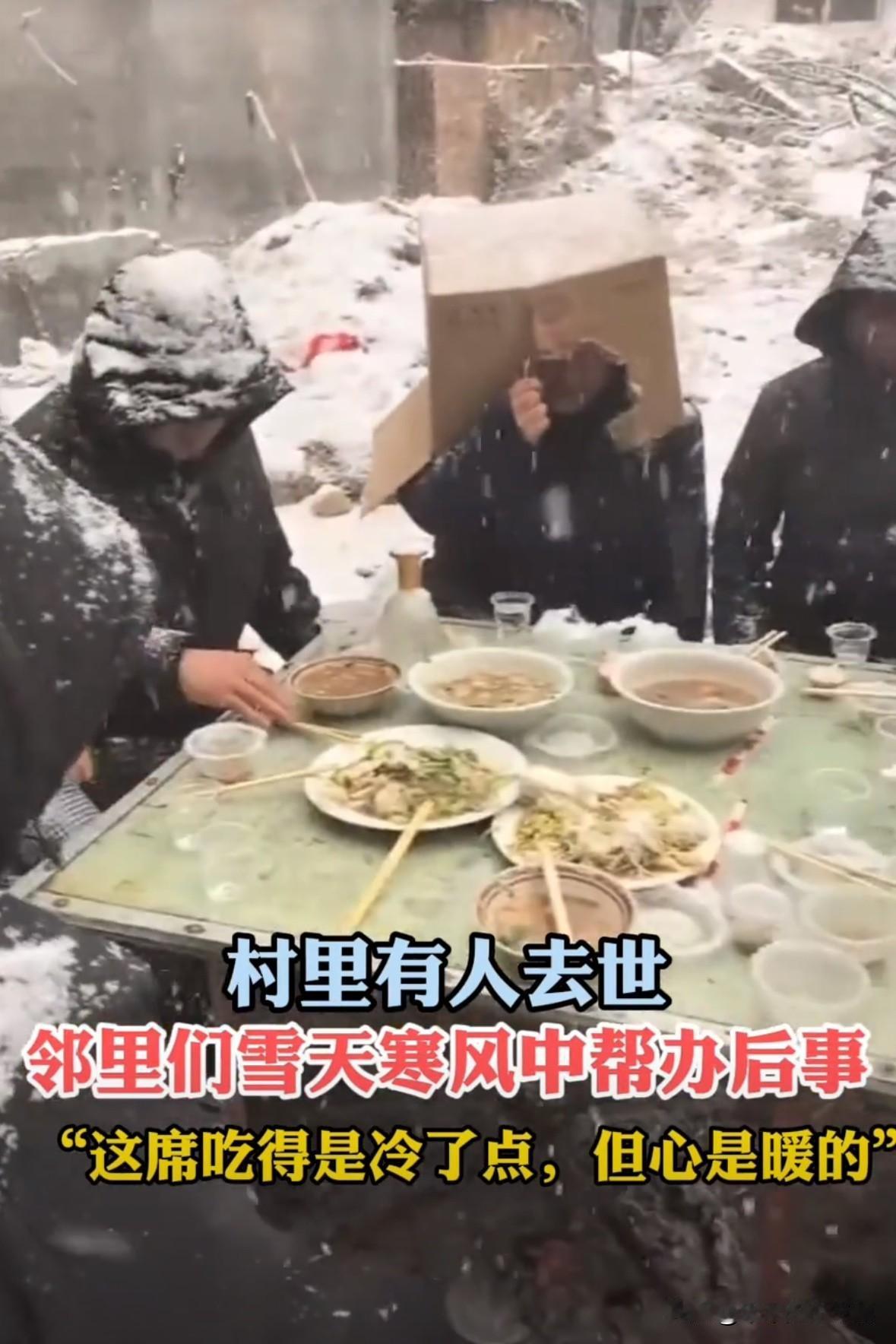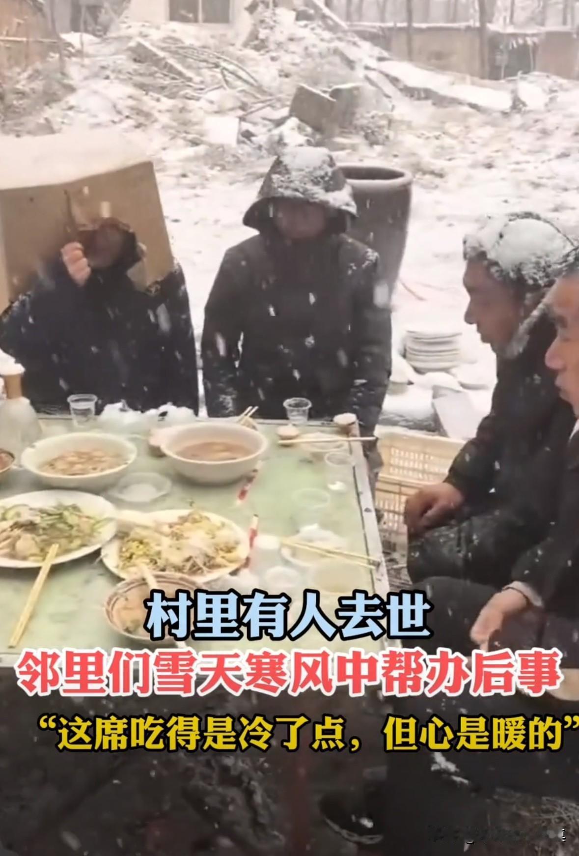 农村有老人去世,来帮忙的乡亲们冰天雪地里帮忙办后事,但是冒着雪吃席,确实有点冷。 其实农村办白事大多数都是这样的,当天不管是下雨或者下雪,都要去帮忙的。 虽然吃席的时候,条件有点恶劣,但是大家的心都是热的。 我觉得只有在农村,才能感受到乡里乡亲的温暖和亲切。农村人丧事习俗