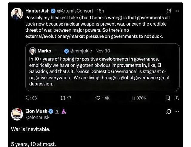 马斯克大半夜在网上发文预测战争,这次可不是闹着玩的!马斯克又发文了,这次的内容可