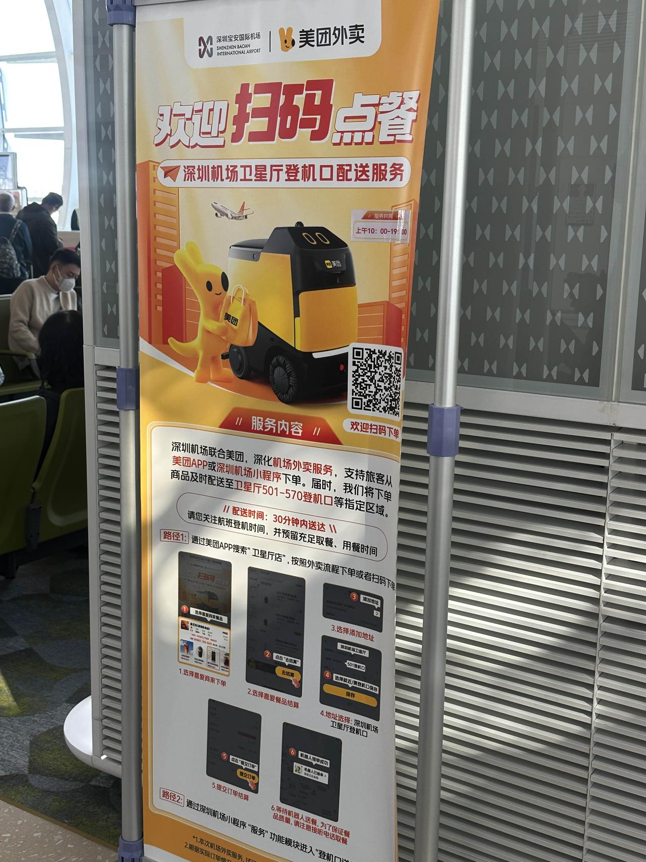 深圳宝安机场美团外卖 卫星厅登机口扫码送餐服务,这个有点意思,而且还是无人自动化机器,深圳机场有点超前的,这样我就不需要跑过去买了~ 下次可以尝试一下,希望配送时间不要太久~ 无人美团外卖 深圳无人机送餐