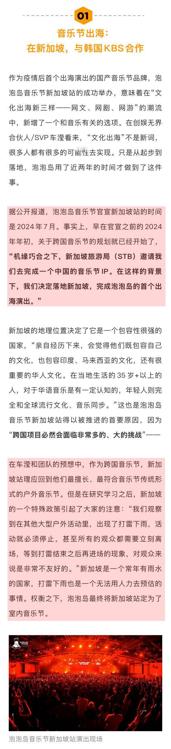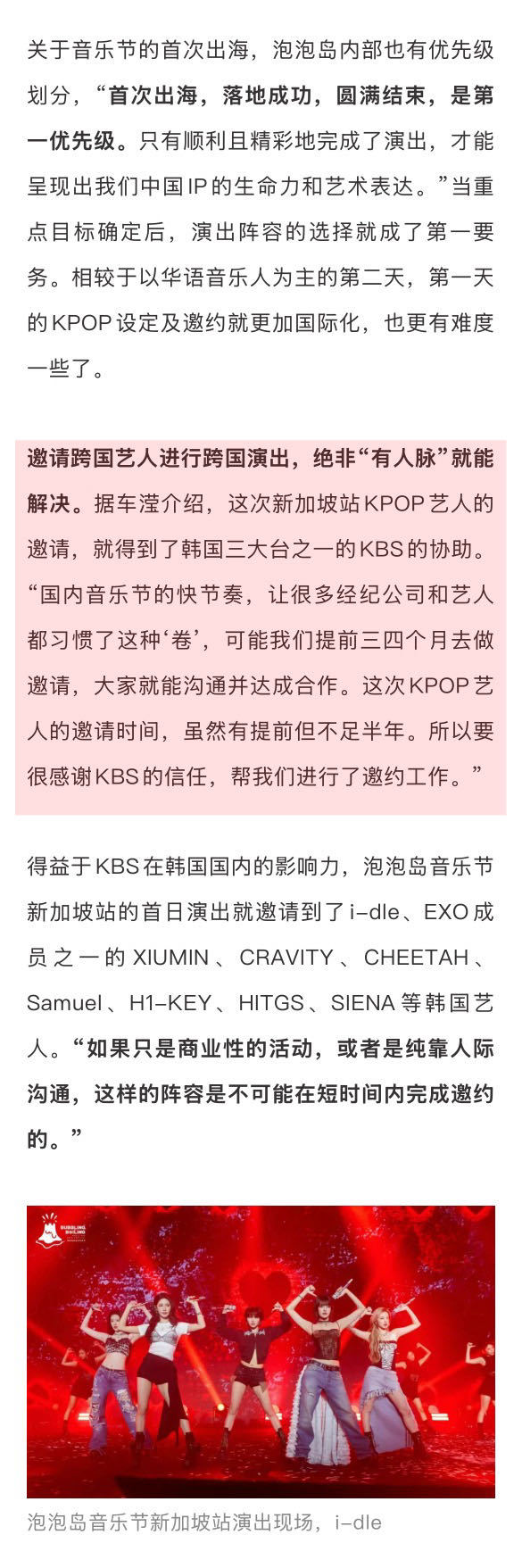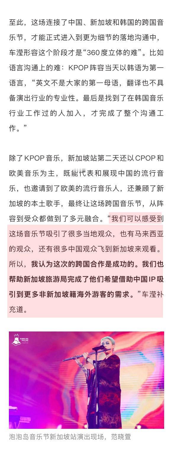 主办方谈音乐节顶流扛票房 主办方谈于适庄达菲上音乐节 关于音乐节的首次出海,泡泡岛内部对于新加坡站的演出也有优先级划分,“首次出海,落地成功,圆满结束,是第一优先级。”相较于以华语音乐人为主的第二天,第一天的KPOP设定及邀约就更加国际化,也更有难度一些了。因为邀请跨国艺人进行跨国演出,绝非“有人脉”就能解决…娱理独家↓