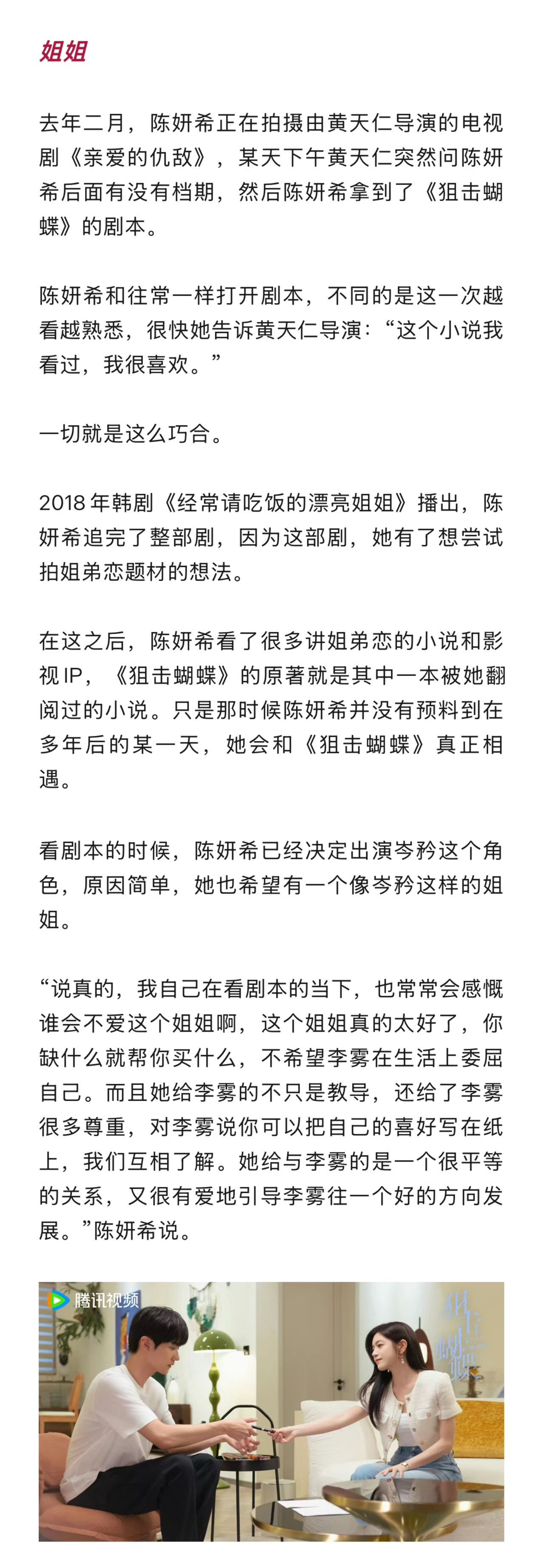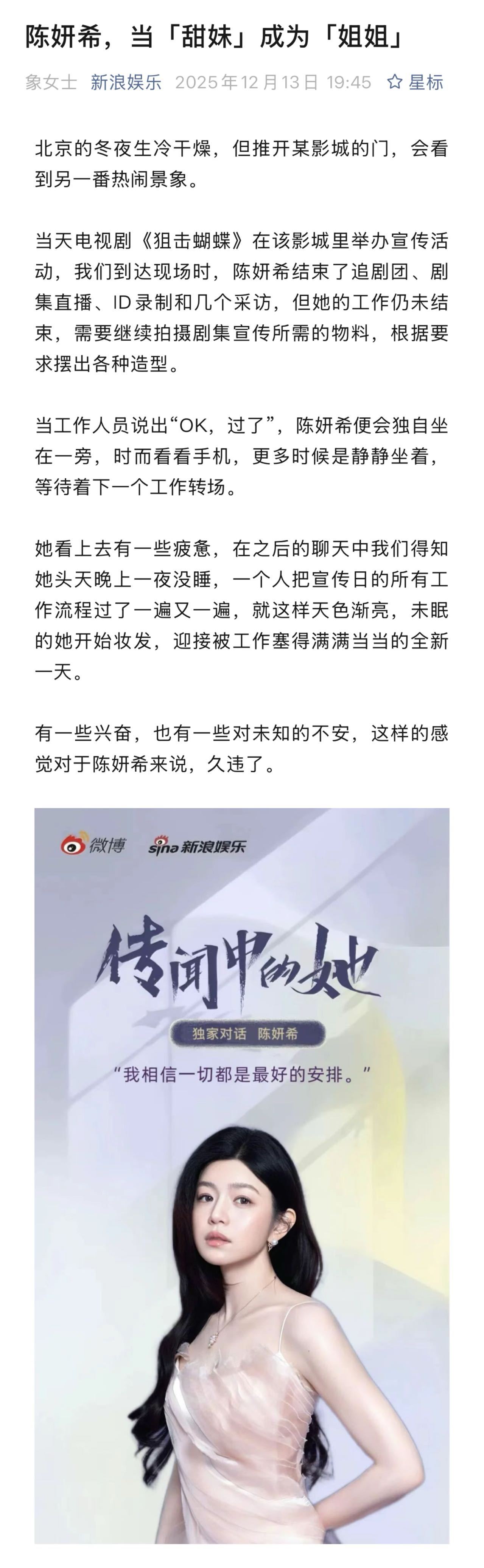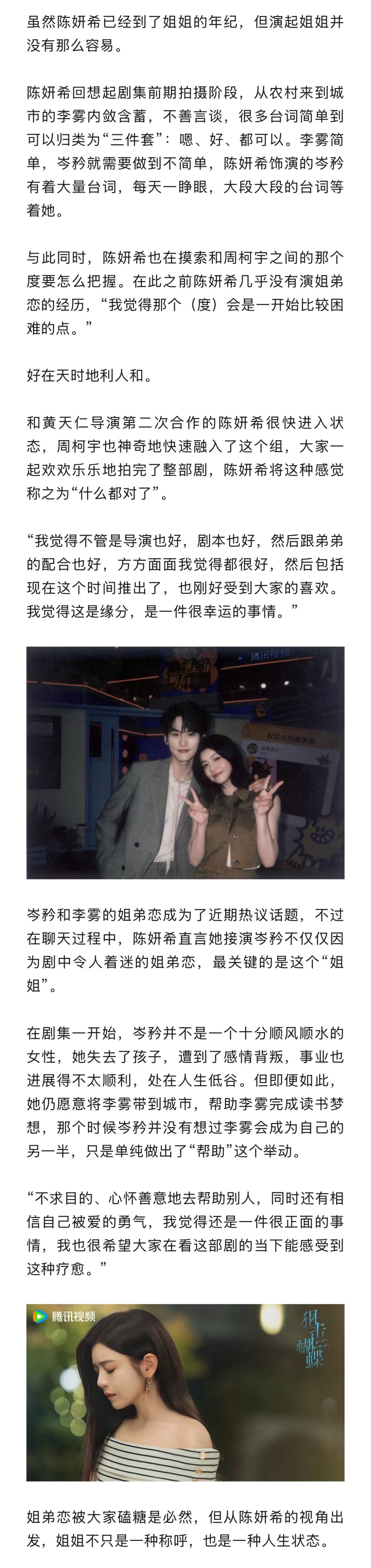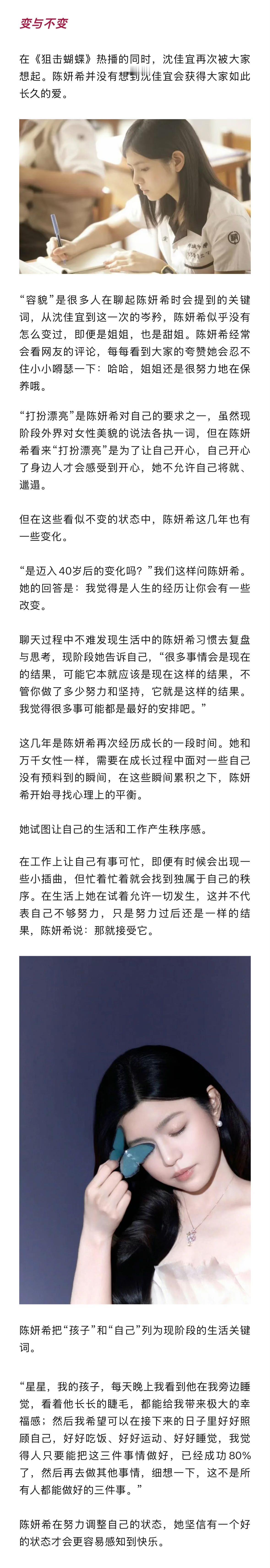 陈妍希说现在允许一切发生陈妍希说还没有想过退休 在《狙击蝴蝶》里,她是温柔又有力量的岑矜;镜头之外,她是懂得和自己和解的陈妍希。学会接受结果,却从不放弃努力,这大概就是她越活越松弛、越演越有味道的原因。