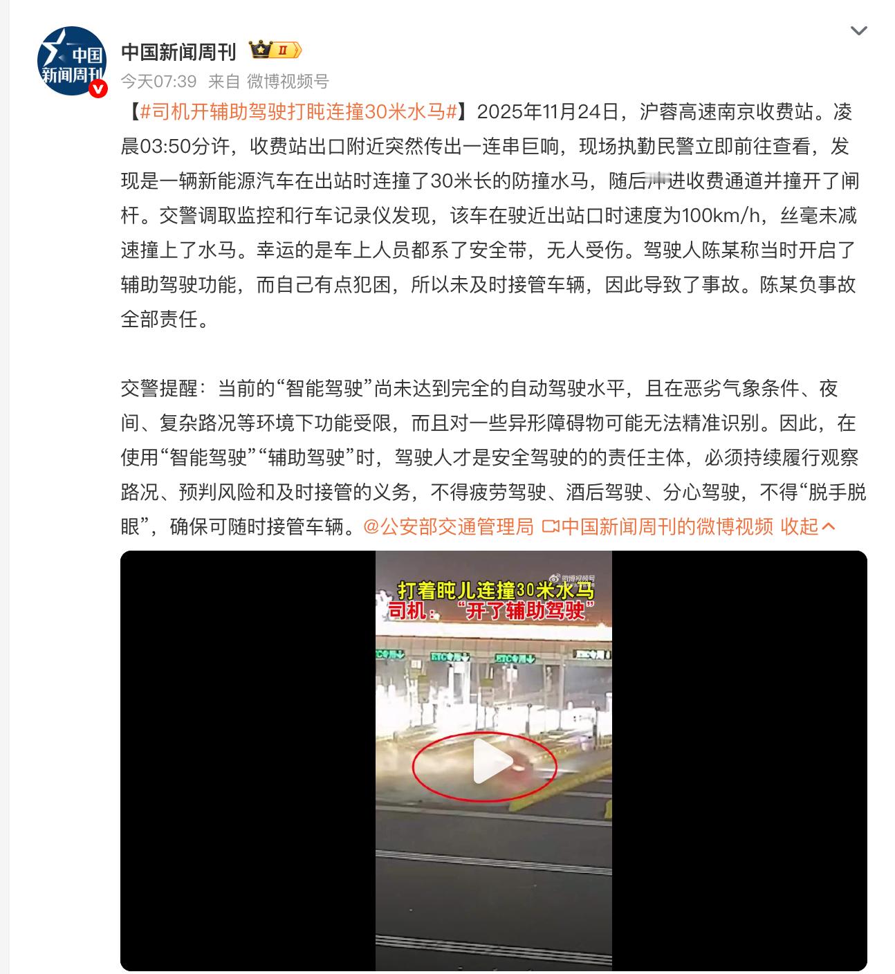 司机开辅助驾驶打盹连撞30米水马,这种情况其实不少,尤其是高速,长途奔袭辅助驾驶确实会使得一些精力不足的驾驶员,直接失能。这起事故车在驶近出站口时速度为100km/h,丝毫未减速撞上了水马,所以辅助驾驶的安全性确实仍需努力,失能情况下要及时提醒,最差也要保证在障碍物前刹停。好在这次车上人员都系了安全带,无人受伤。