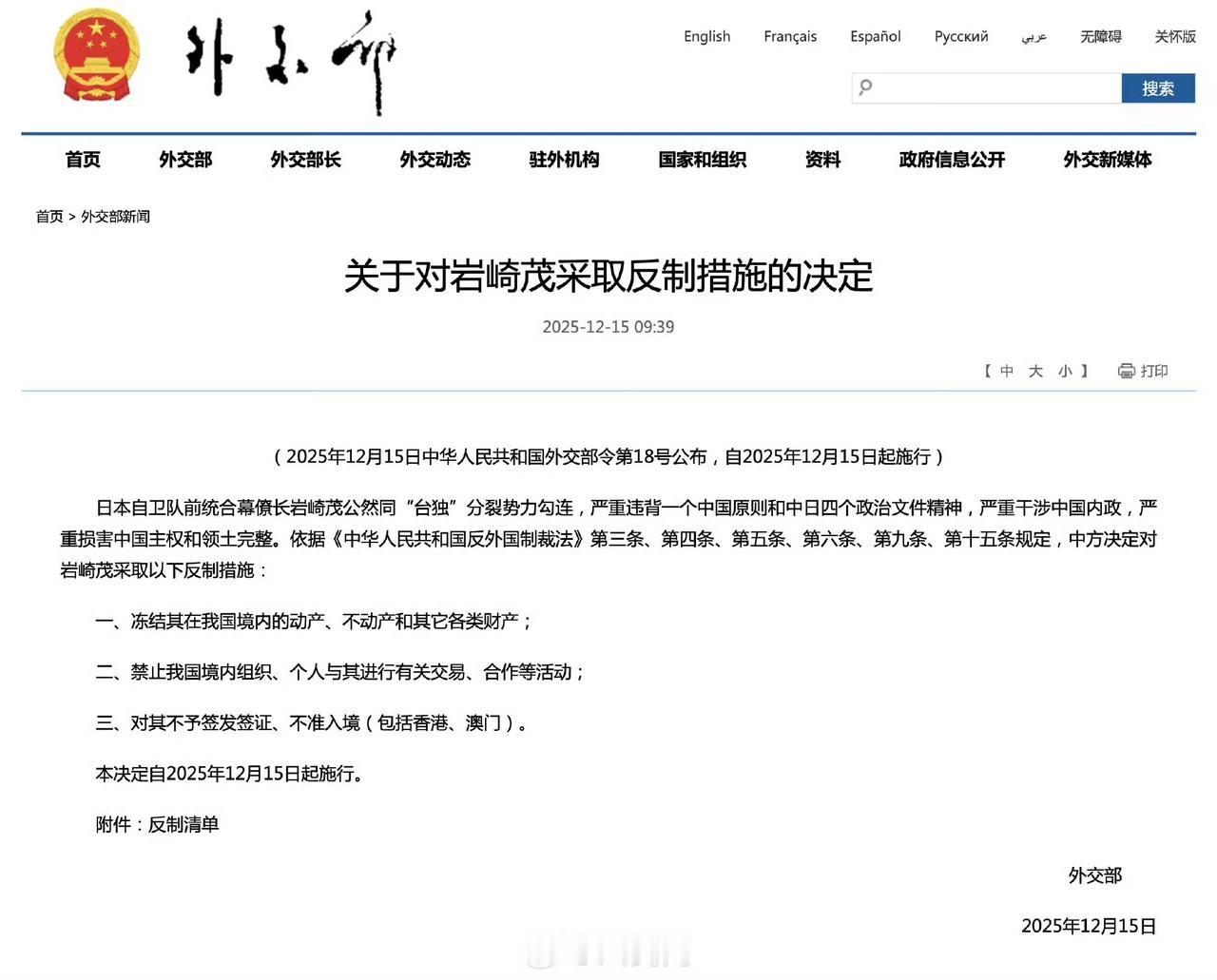 外交部:对日本自卫队前统合幕僚长采取反制。
